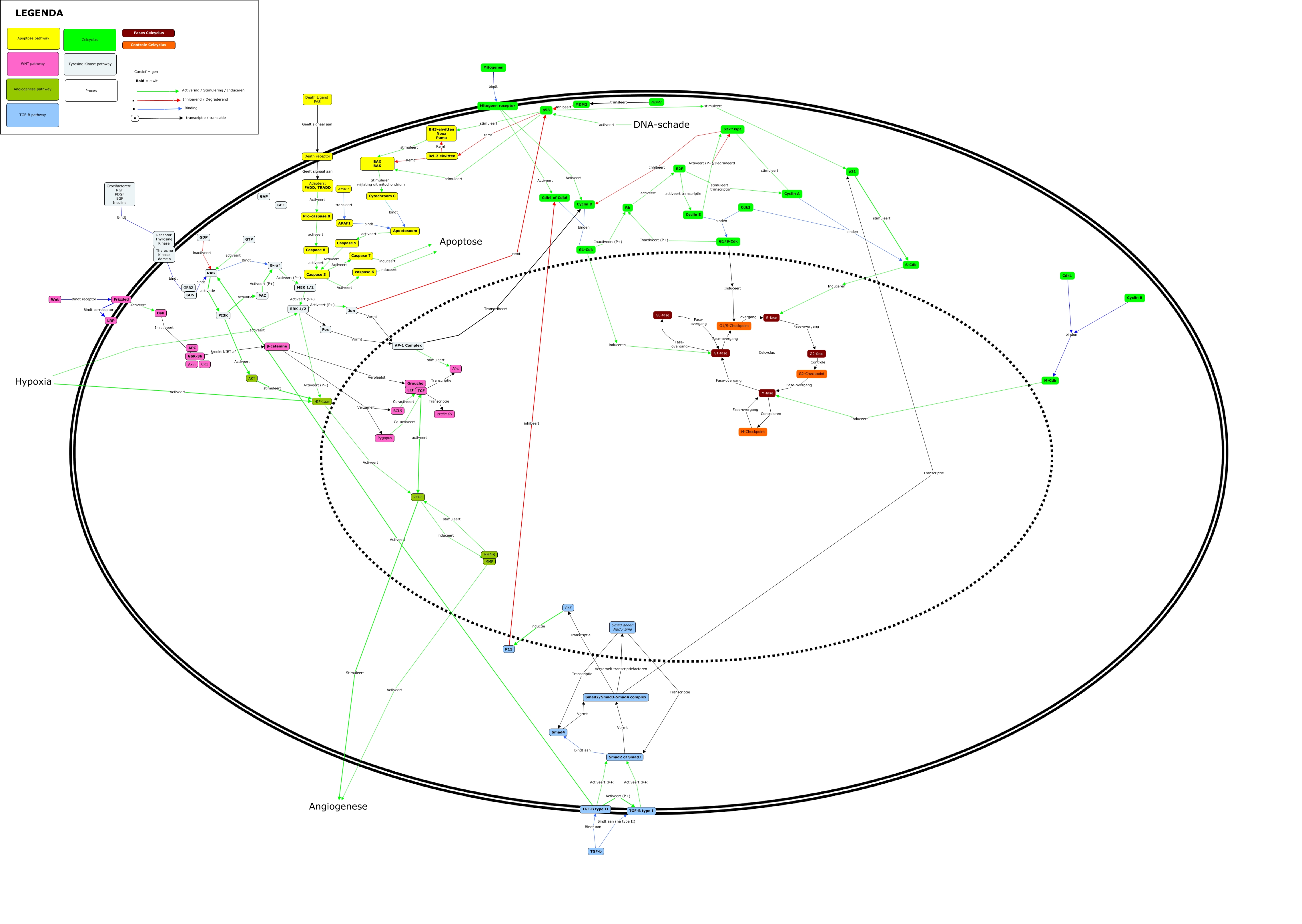 Deze Concept Map heeft informatie gerelateerd aan: BACK-UP 1802, p21 stimuleert S-Cdk, Cdk1 binden M-Cdk, Caspase 3 Activeert caspase 6, . Binding, BH3-eiwitten Noxa Puma stimuleert BAX BAK, Dsh Inactiveert GSK-3b, Caspase 3 Activeert Caspase 7, G1/S-Checkpoint overgang S-fase, Wnt Bindt receptor Frizzled, Mitogeen receptor Activeert Cdk4 of Cdk6, AP-1 Complex stimuleert Myc, Smad2/Smad3-Smad4 complex Transcriptie p21, β-catenine Verplaatst Groucho, p53 stimuleert BH3-eiwitten Noxa Puma, S-Cdk Induceren S-fase, Hypoxia Activeert HIF-1aæ, Pygopus Co-activeert TCF, TCF Transcriptie cyclin D1, Smad2 of Smad3 Bindt aan Smad4, P15 inhibeert Cdk4 of Cdk6