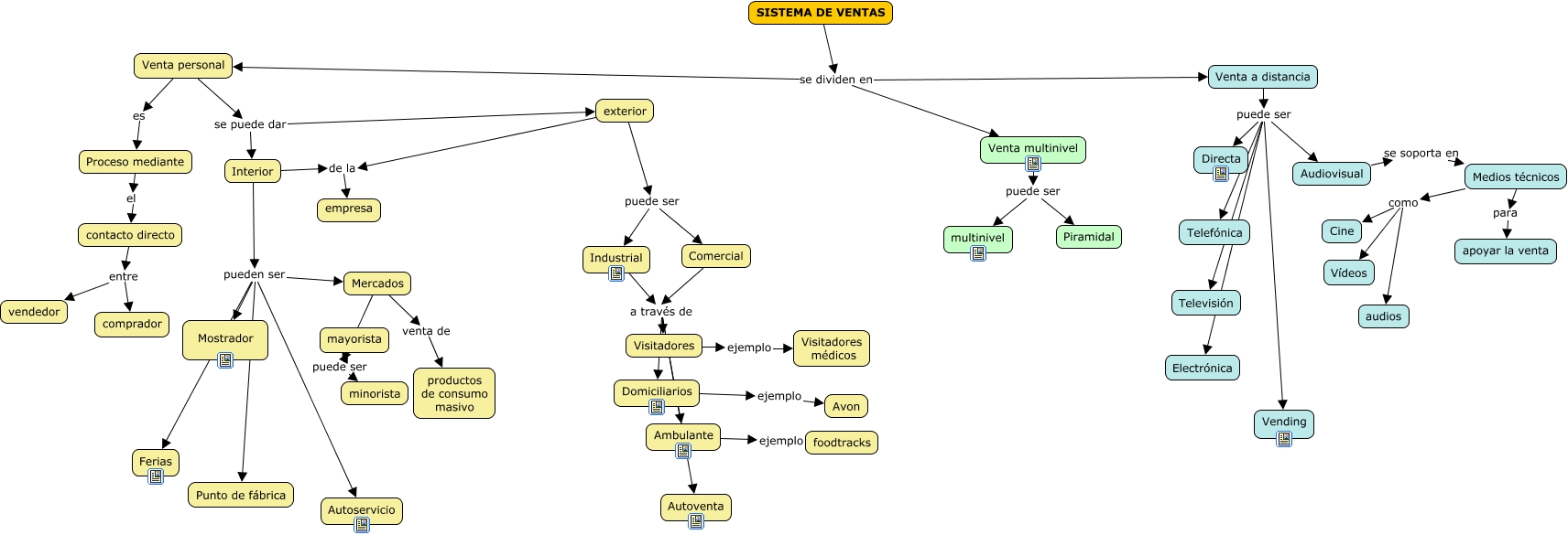 Este Cmap, tiene información relacionada con: sistema_ventas, Industrial a través de Autoventa, Venta a distancia puede ser Audiovisual, Medios técnicos como Vídeos, Industrial a través de Visitadores, Audiovisual se soporta en Medios técnicos, Interior pueden ser Mercados, Venta personal se puede dar Interior, Industrial a través de Domiciliarios, exterior de la empresa, Venta multinivel puede ser Piramidal, Venta a distancia puede ser Directa, SISTEMA DE VENTAS se dividen en Venta a distancia, Ambulante ejemplo foodtracks, Mercados puede ser minorista, Mercados puede ser mayorista, Venta a distancia puede ser Televisión, exterior puede ser Comercial, Comercial a través de Visitadores, Venta a distancia puede ser Vending, Interior pueden ser Autoservicio