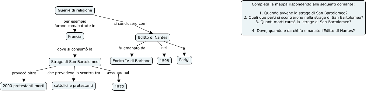 Questa Cmap, creata con IHMC CmapTools, contiene informazioni relative a: 3. Strage di San Bartolomeo, Editto di Nantes a Parigi, Francia dove si consumò la Strage di San Bartolomeo, Strage di San Bartolomeo che prevedeva lo scontro tra cattolici e protestanti, Guerre di religione si conclusero con l' Editto di Nantes, Editto di Nantes nel 1598, Guerre di religione per esempio furono comabattute in Francia, Strage di San Bartolomeo provocò oltre 2000 protestanti morti, Editto di Nantes fu emanato da Enrico IV di Borbone, Strage di San Bartolomeo avvenne nel 1572