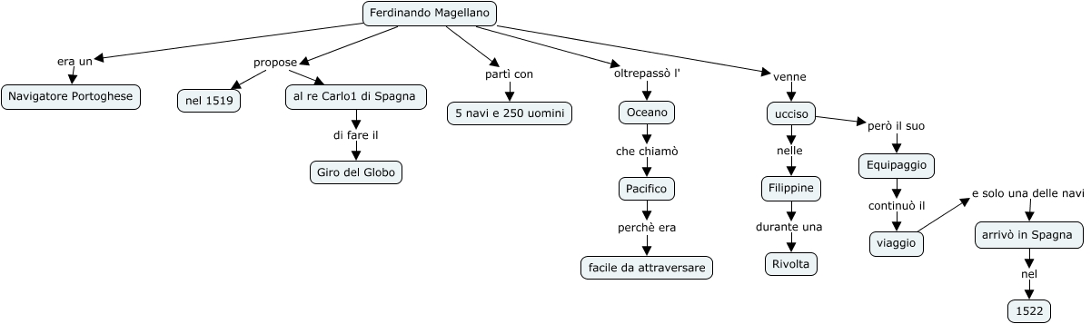 Questa Cmap, creata con IHMC CmapTools, contiene informazioni relative a: Ferdinando Magellano, al re Carlo1 di Spagna di fare il Giro del Globo, Ferdinando Magellano venne ucciso, Ferdinando Magellano partì con 5 navi e 250 uomini, ucciso però il suo Equipaggio, ucciso nelle Filippine, arrivò in Spagna nel 1522, Oceano che chiamò Pacifico, Ferdinando Magellano propose nel 1519, Ferdinando Magellano oltrepassò l' Oceano, Ferdinando Magellano propose al re Carlo1 di Spagna, Ferdinando Magellano era un Navigatore Portoghese, Filippine durante una Rivolta, Equipaggio continuò il viaggio, viaggio e solo una delle navi arrivò in Spagna, Pacifico perchè era facile da attraversare