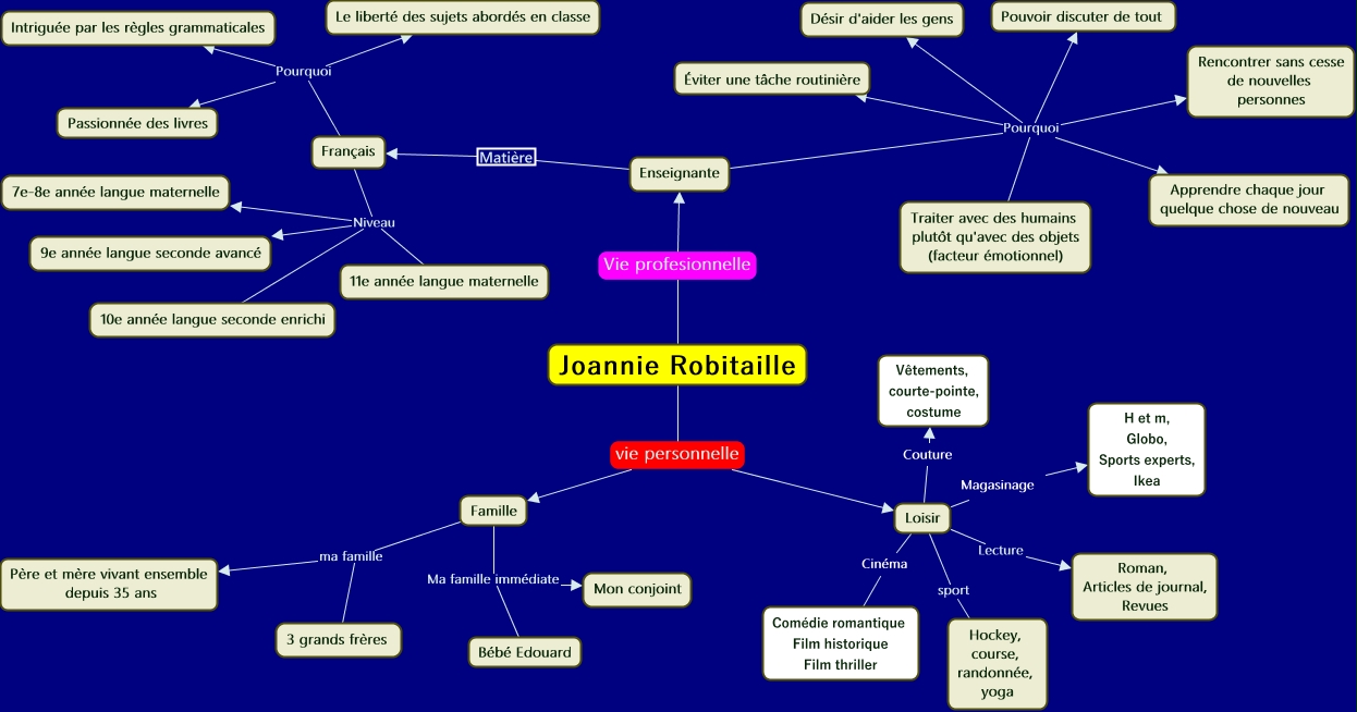 This Concept Map, created with IHMC CmapTools, has information related to: Robitaille_Joannie-Présentation personnelle, Loisir Cinéma Comédie romantique Film historique Film thriller, Famille Ma famille immédiate Bébé Edouard, Enseignante Matière Français, Français Niveau 11e année langue maternelle, Français Niveau 7e-8e année langue maternelle, Famille ma famille 3 grands frères, Français Pourquoi Intriguée par les règles grammaticales, Loisir Magasinage H et m, Globo, Sports experts, Ikea, Enseignante Pourquoi Pouvoir discuter de tout, Enseignante Pourquoi Désir d'aider les gens, Famille ma famille Père et mère vivant ensemble depuis 35 ans, Loisir Couture Vêtements, courte-pointe, costume, Joannie Robitaille Vie profesionnelle Enseignante, Enseignante Pourquoi Traiter avec des humains plutôt qu'avec des objets (facteur émotionnel), Joannie Robitaille vie personnelle Famille, Enseignante Pourquoi Éviter une tâche routinière, Enseignante Pourquoi Apprendre chaque jour quelque chose de nouveau, Enseignante Pourquoi Rencontrer sans cesse de nouvelles personnes, Français Pourquoi Le liberté des sujets abordés en classe, Loisir sport Hockey, course, randonnée, yoga