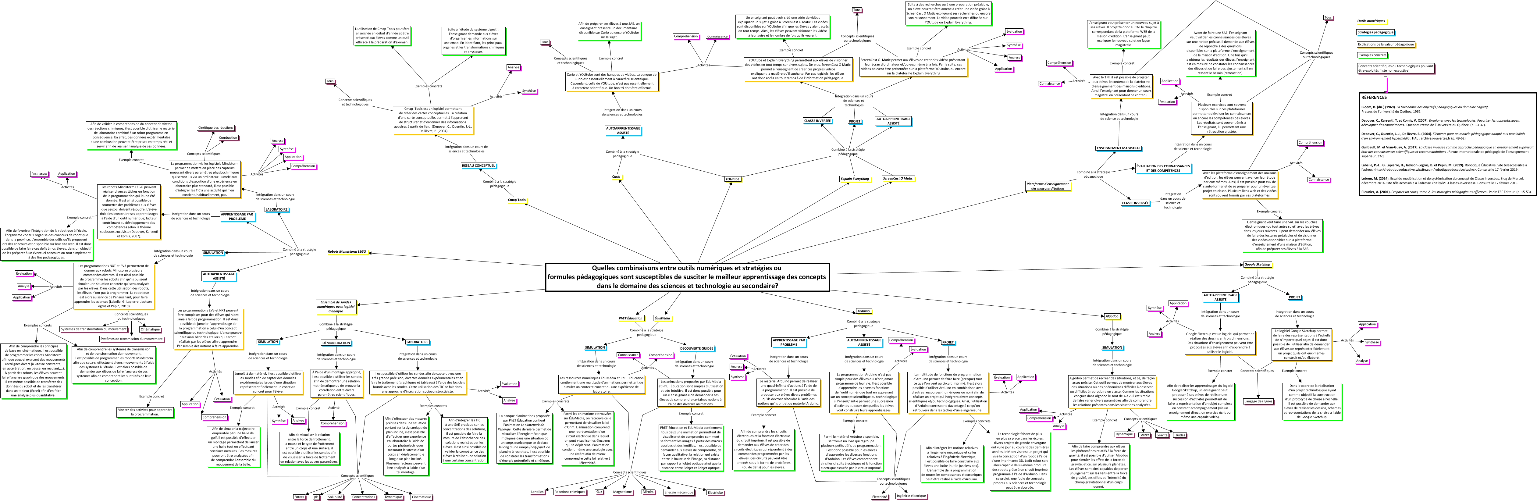 Cette carte de concepts créée avec IHMC CmapTools traite de: PED879_CamiréM-Demers Giroux PO_SAÉ2, Il est possible d'utiliser les sondes afin de capter, avec une très grande précision, diverses données expérimentales et en faire le traitement (graphiques et tableaux) à l'aide des logiciels fournis avec les sondes. Cette utilisation des TIC se fait dans une approche d'intégration socioconstructiviste. Activités Évaluation, Le matériel Arduino permet de réaliser une quasi-infinité d'actions à l'aide de la programmation. Il est possible de proposer aux élèves divers problèmes qu'ils devront résoudre à l'aide des notions qu'ils ont et du matériel Arduino. Activités Évaluation, Quelles combinaisons entre outils numériques et stratégies ou formules pédagogiques sont susceptibles de susciter le meilleur apprentissage des concepts dans le domaine des sciences et technologie au secondaire? ???? ScreenCast O Matic, Quelles combinaisons entre outils numériques et stratégies ou formules pédagogiques sont susceptibles de susciter le meilleur apprentissage des concepts dans le domaine des sciences et technologie au secondaire? ???? Arduino, Curio Combiné à la stratégie pédagogique AUTOAPPRENTISSAGE ASSISTÉ, Le matériel Arduino permet de réaliser une quasi-infinité d'actions à l'aide de la programmation. Il est possible de proposer aux élèves divers problèmes qu'ils devront résoudre à l'aide des notions qu'ils ont et du matériel Arduino. Concepts scientifiques ou technologiques Ingénirie électrique, La programmation via les logiciels Mindstorm permet de mettre en place des capteurs mesurant divers paramètres physicochimiques qui seront lus via un ordinateur. Jumelé aux conditions d'exécution d'une expérience en laboratoire plus standard, il est possible d'intégrer les TIC à une activité qui n'en contient, habituellement, pas. Activités Synthèse, Les ressources numériques ÉduMédia et PhET Éducation contiennent une multitude d'animations permettant de simuler un contexte concret ou une expérience de laboratoire. Activités Compréhension, ScreenCast O Matic permet aux élèves de créer des vidéos présentant leur écran d'ordinateur et/ou eux même à la fois. Par la suite, ces vidéos peuvent être présentées sur la plateforme YOUtube, ou encore sur la plateforme Explain Everything Activités Application, Plusieurs exercices sont souvent disponibles sur ces plateformes permettant d'évaluer les connaissances ou encore les compétences des élèves. Les résultats sont souvent émis à l'enseignant, lui permettant une rétroaction ajustée. Exemple concret Avant de faire une SAE, l'enseignant veut valider les connaissances des élèves sur une notion précise. Il demande aux élèves de répondre à des questions disponibles sur la plateforme d'enseignement de la maison d'édition. Une fois qu'il a obtenu les résultats des élèves, l'enseignant est en mesure de constater les connaissances des élèves et de faire des ajustement s'il en ressent le besoin (rétroaction)., Les animations proposées par ÉduMédia et PhET Éducation sont simples d'utilisation et très intuitive. Il est donc possible pour un·e enseignant·e de demander à ses élèves de comprendre certaines notions à l'aide des diverses animations. Concepts scientifiques Magnétisme, Les programmations NXT et EV3 permettent de donner aux robots Mindsorm plusieurs commandes diverses. Il est ainsi possible de programmer les robots afin qu'ils puissent simuler une situation concrète qui sera analysée par les élèves. Dans cette utilisation des robots, les élèves n'ont pas à programmer. La robotique est alors au service de l'enseignant, pour faire apprendre les sciences (Labelle, G. Lapierre, Jackson- Legros et Pépin, 2019). Concepts scientifiques ou technologiques Systèmes de transformation du mouvement, Il est possible d'utiliser les sondes afin de capter, avec une très grande précision, diverses données expérimentales et en faire le traitement (graphiques et tableaux) à l'aide des logiciels fournis avec les sondes. Cette utilisation des TIC se fait dans une approche d'intégration socioconstructiviste. Concepts scientifiques Forces, À l'aide d'un montage approprié, il est possible d'utiliser les sondes afin de démontrer une relation mathématique ou de prouver la corrélation entre divers paramètres scientifiques. Concepts scientifiques Dynamique, PhET Éducation Combiné à la stratégie pédagogique SIMULATION, Plateforme d'enseignement des maisons d'édition Combiné à la stratégie pédagogique ENSEIGNEMENT MAGISTRAL, Cmap Tools est un logiciel permettant de créer des cartes conceptuelles. La création d'une carte conceptuelle, permet à l'apprenant de structurer et d'ordonner des informations acquises à partir de lien. (Depover, C., Quentin, J.-J., De lièvre, B. ,2004) Exemples concrets Suite à l'étude du système digestif, l'enseignant demande aux élèves d'organiser les informations sur une cmap. En identifiant, les principaux organes et les transformations chimiques et physiques., Les animations proposées par ÉduMédia et PhET Éducation sont simples d'utilisation et très intuitive. Il est donc possible pour un·e enseignant·e de demander à ses élèves de comprendre certaines notions à l'aide des diverses animations. Concepts scientifiques Électricité, PROJET Intégration dans un cours de sciences et technologies ScreenCast O Matic permet aux élèves de créer des vidéos présentant leur écran d'ordinateur et/ou eux même à la fois. Par la suite, ces vidéos peuvent être présentées sur la plateforme YOUtube, ou encore sur la plateforme Explain Everything, Algodoo permet de recréer des situations, et ce, de façon assez précise. Cet outil permet de montrer aux élèves des situations ou des phénomènes difficiles à observer ou difficiles à reproduire en classe. Comme les situations conçues dans Algodoo le sont de A à Z, i
