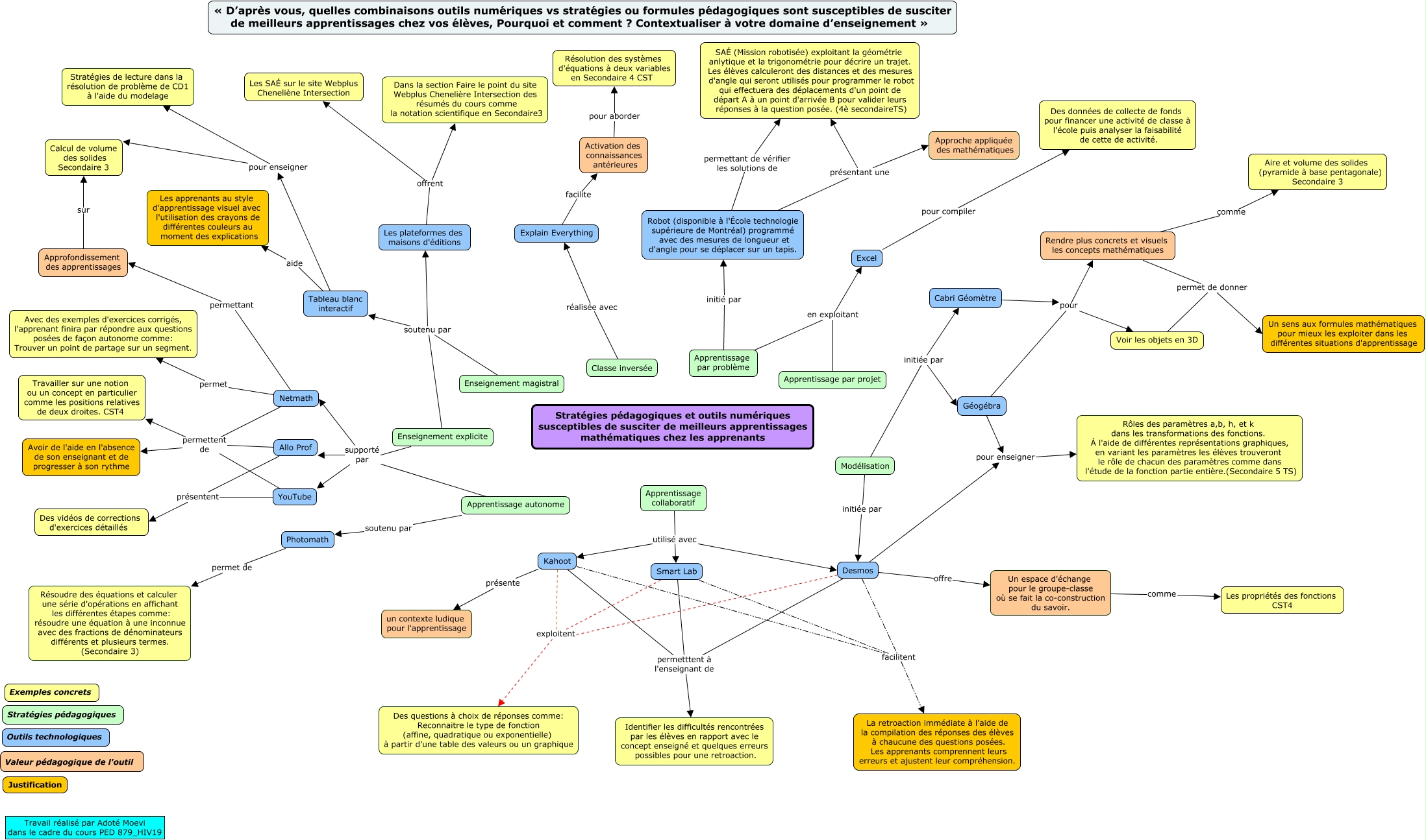 Cette carte de concepts créée avec IHMC CmapTools traite de: MoeviAdotè_SAÉ2, Desmos pour enseigner Rôles des paramètres a,b, h, et k dans les transformations des fonctions. À l'aide de différentes représentations graphiques, en variant les paramètres les élèves trouveront le rôle de chacun des paramètres comme dans l'étude de la fonction partie entière.(Secondaire 5 TS), Netmath permettent de Travailler sur une notion ou un concept en particulier comme les positions relatives de deux droites. CST4, Enseignement explicite soutenu par Enseignement magistral, Cabri Géomètre pour Rendre plus concrets et visuels les concepts mathématiques, Kahoot facilitent La retroaction immédiate à l'aide de la compilation des réponses des élèves à chaucune des questions posées. Les apprenants comprennent leurs erreurs et ajustent leur compréhension., Smart Lab permetttent à l'enseignant de Identifier les difficultés rencontrées par les élèves en rapport avec le concept enseigné et quelques erreurs possibles pour une retroaction., Excel pour compiler Des données de collecte de fonds pour financer une activité de classe à l'école puis analyser la faisabilité de cette de activité., Modélisation initiée par Cabri Géomètre, Géogébra pour Voir les objets en 3D, Apprentissage autonome supporté par Allo Prof, Apprentissage collaboratif utilisé avec Kahoot, Kahoot permetttent à l'enseignant de Identifier les difficultés rencontrées par les élèves en rapport avec le concept enseigné et quelques erreurs possibles pour une retroaction., YouTube présentent Des vidéos de corrections d'exercices détaillés, Kahoot présente un contexte ludique pour l'apprentissage, Apprentissage collaboratif utilisé avec Desmos, Enseignement explicite soutenu par Les plateformes des maisons d'éditions, Voir les objets en 3D permet de donner Un sens aux formules mathématiques pour mieux les exploiter dans les différentes situations d'apprentissage, Apprentissage par projet en exploitant Excel, Netmath permet Avec des exemples d'exercices corrigés, l'apprenant finira par répondre aux questions posées de façon autonome comme: Trouver un point de partage sur un segment., Tableau blanc interactif pour enseigner Stratégies de lecture dans la résolution de problème de CD1 à l'aide du modelage