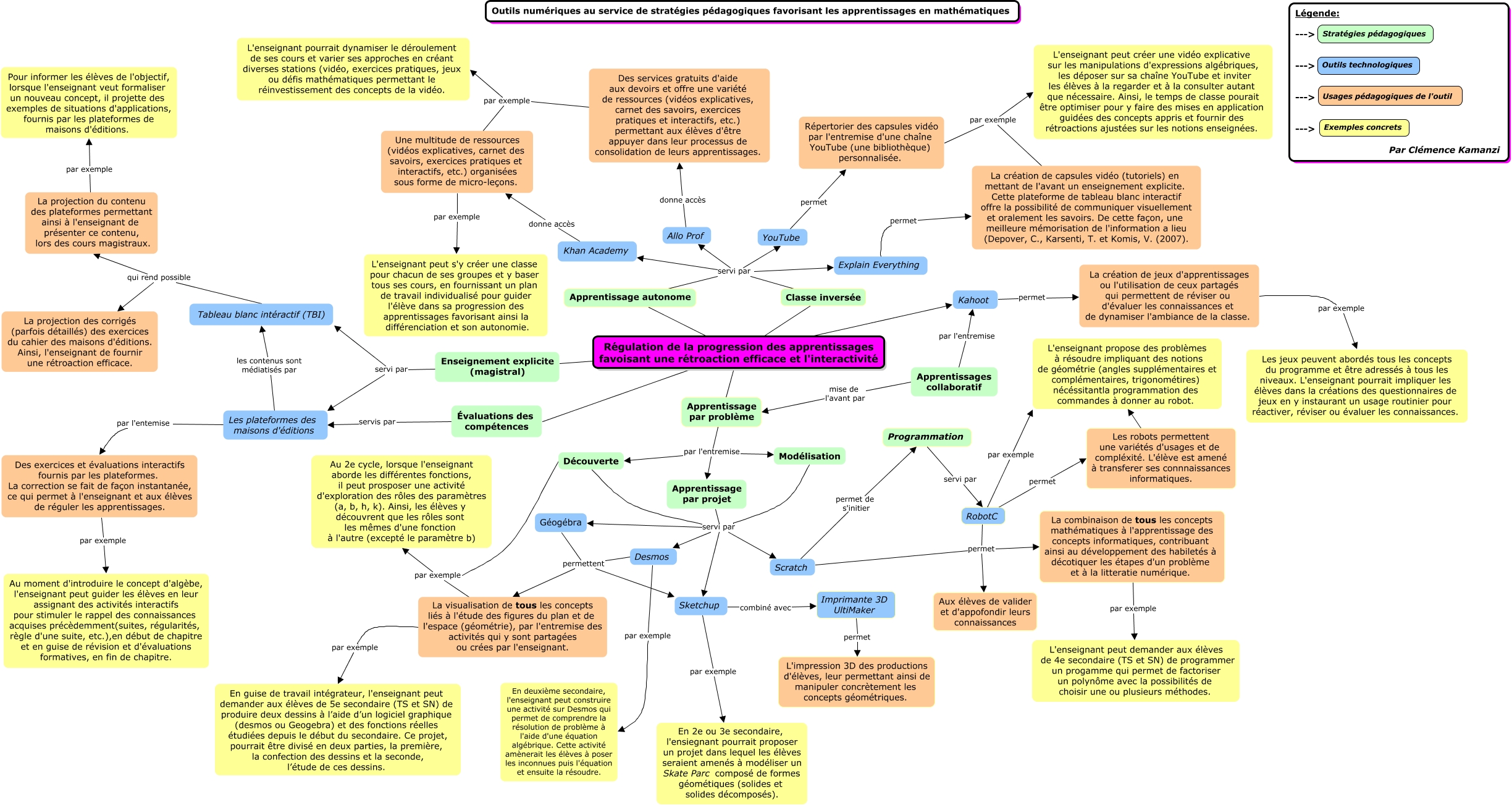 Cette carte de concepts créée avec IHMC CmapTools traite de: Kamanzi_Clémence_SAÉ2, Programmation servi par RobotC, Régulation de la progression des apprentissages favoisant une rétroaction efficace et l'interactivité Kahoot, YouTube permet Répertorier des capsules vidéo par l'entremise d'une chaîne YouTube (une bibliothèque) personnalisée., Explain Everything permet La création de capsules vidéo (tutoriels) en mettant de l'avant un enseignement explicite. Cette plateforme de tableau blanc interactif offre la possibilité de communiquer visuellement et oralement les savoirs. De cette façon, une meilleure mémorisation de l'information a lieu (Depover, C., Karsenti, T. et Komis, V. (2007)., Khan Academy donne accès Une multitude de ressources (vidéos explicatives, carnet des savoirs, exercices pratiques et interactifs, etc.) organisées sous forme de micro-leçons., Une multitude de ressources (vidéos explicatives, carnet des savoirs, exercices pratiques et interactifs, etc.) organisées sous forme de micro-leçons. par exemple L'enseignant peut s'y créer une classe pour chacun de ses groupes et y baser tous ses cours, en fournissant un plan de travail individualisé pour guider l'élève dans sa progression des apprentissages favorisant ainsi la différenciation et son autonomie., RobotC par exemple L'enseignant propose des problèmes à résoudre impliquant des notions de géométrie (angles supplémentaires et complémentaires, trigonométires) nécéssitantla programmation des commandes à donner au robot., Les robots permettent une variétés d'usages et de compléxité. L'élève est amené à transferer ses connnaissances informatiques. L'enseignant propose des problèmes à résoudre impliquant des notions de géométrie (angles supplémentaires et complémentaires, trigonométires) nécéssitantla programmation des commandes à donner au robot., Apprentissage par problème par l'entremise Apprentissage par projet, Kahoot permet La création de jeux d'apprentissages ou l'utilisation de ceux partagés qui permettent de réviser ou d'évaluer les connaissances et de dynamiser l'ambiance de la classe., Classe inversée servi par Explain Everything, Enseignement explicite (magistral) servi par Les plateformes des maisons d'éditions, Des exercices et évaluations interactifs fournis par les plateformes. La correction se fait de façon instantanée, ce qui permet à l'enseignant et aux élèves de réguler les apprentissages. par exemple Au moment d'introduire le concept d'algèbe, l'enseignant peut guider les élèves en leur assignant des activités interactifs pour stimuler le rappel des connaissances acquises précèdemment(suites, régularités, règle d'une suite, etc.),en début de chapitre et en guise de révision et d'évaluations formatives, en fin de chapitre., Les plateformes des maisons d'éditions par l'entemise Des exercices et évaluations interactifs fournis par les plateformes. La correction se fait de façon instantanée, ce qui permet à l'enseignant et aux élèves de réguler les apprentissages., Apprentissage par problème par l'entremise Modélisation, La visualisation de tous les concepts liés à l'étude des figures du plan et de l'espace (géométrie), par l'entremise des activités qui y sont partagées ou crées par l'enseignant. par exemple En guise de travail intégrateur, l'enseignant peut demander aux élèves de 5e secondaire (TS et SN) de produire deux dessins à l’aide d’un logiciel graphique (desmos ou Geogebra) et des fonctions réelles étudiées depuis le début du secondaire. Ce projet, pourrait être divisé en deux parties, la première, la confection des dessins et la seconde, l’étude de ces dessins., RobotC permet Aux élèves de valider et d'appofondir leurs connaissances, La création de capsules vidéo (tutoriels) en mettant de l'avant un enseignement explicite. Cette plateforme de tableau blanc interactif offre la possibilité de communiquer visuellement et oralement les savoirs. De cette façon, une meilleure mémorisation de l'information a lieu (Depover, C., Karsenti, T. et Komis, V. (2007). par exemple L'enseignant peut créer une vidéo explicative sur les manipulations d'expressions algébriques, les déposer sur sa chaîne YouTube et inviter les élèves à la regarder et à la consulter autant que nécessaire. Ainsi, le temps de classe pourait être optimiser pour y faire des mises en application guidées des concepts appris et fournir des rétroactions ajustées sur les notions enseignées., Desmos permettent La visualisation de tous les concepts liés à l'étude des figures du plan et de l'espace (géométrie), par l'entremise des activités qui y sont partagées ou crées par l'enseignant., Régulation de la progression des apprentissages favoisant une rétroaction efficace et l'interactivité Enseignement explicite (magistral)