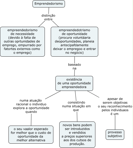 Esse mapa conceitual, produzido no IHMC CmapTools, tem a informação relacionada a: empreendedorismo_2, existência de uma oportunidade empreendedora numa atuação racional o individuo explora a oportunidade quando o seu vaalor esperado for melhor que o custo de oportunidade da melhor alternativa, Emprendedorismo distinção entre empreendedotrismo de oportunidade (procura voluntáaria deoportunidades, planeia antecipafdamente deixar o empregoo e entrar no negócio), Emprendedorismo distinção entre empreendedorismo de necessidade (devido à falta de outras oprtunidades de emprego, empurrado por fatortes externos como o emprego), existência de uma oportunidade empreendedora apesar de serem objetivas o seu reconhecimento pelos individuaos é um provesso subjetivo, existência de uma oportunidade empreendedora consistindo numa situação em que novos bens podem ser introduzidos e vendidos a preços superiores aos dos cutsos de produção., empreendedotrismo de oportunidade (procura voluntáaria deoportunidades, planeia antecipafdamente deixar o empregoo e entrar no negócio) baseado na existência de uma oportunidade empreendedora