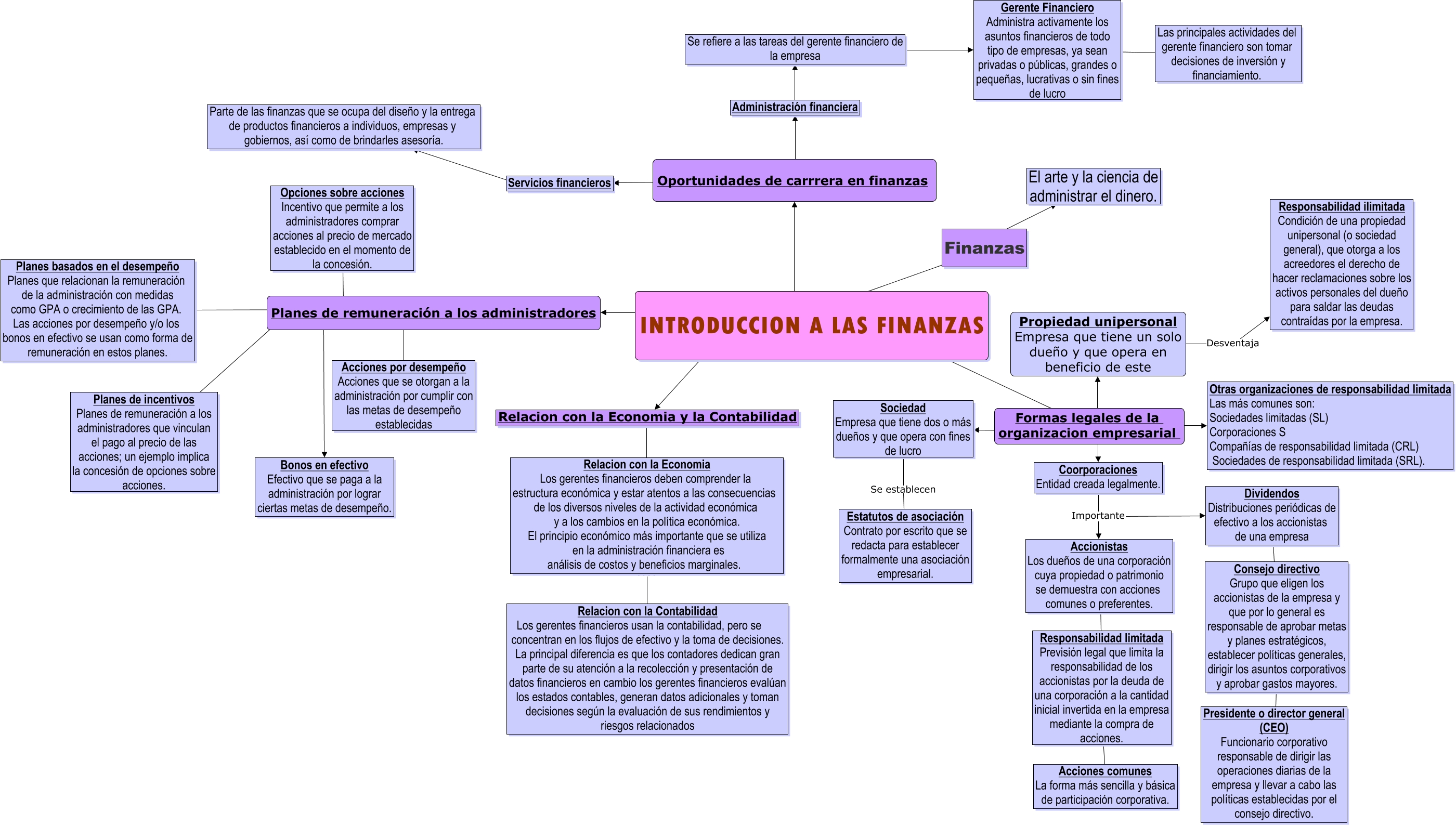 Este Cmap, tiene información relacionada con: mapa conceptual naturaleza de los costos1, INTRODUCCION A LAS FINANZAS ???? Oportunidades de carrrera en finanzas, Consejo directivo Grupo que eligen los accionistas de la empresa y que por lo general es responsable de aprobar metas y planes estratégicos, establecer políticas generales, dirigir los asuntos corporativos y aprobar gastos mayores. ???? Presidente o director general (CEO) Funcionario corporativo responsable de dirigir las operaciones diarias de la empresa y llevar a cabo las políticas establecidas por el consejo directivo., Servicios financieros ???? Parte de las finanzas que se ocupa del diseño y la entrega de productos financieros a individuos, empresas y gobiernos, así como de brindarles asesoría., Planes de remuneración a los administradores ???? Planes basados en el desempeño Planes que relacionan la remuneración de la administración con medidas como GPA o crecimiento de las GPA. Las acciones por desempeño y/o los bonos en efectivo se usan como forma de remuneración en estos planes., Administración financiera ???? Se refiere a las tareas del gerente financiero de la empresa, Coorporaciones Entidad creada legalmente. Importante Dividendos Distribuciones periódicas de efectivo a los accionistas de una empresa, Oportunidades de carrrera en finanzas ???? Administración financiera, Planes de remuneración a los administradores ???? Bonos en efectivo Efectivo que se paga a la administración por lograr ciertas metas de desempeño., Formas legales de la organizacion empresarial ???? Otras organizaciones de responsabilidad limitada Las más comunes son: Sociedades limitadas (SL) Corporaciones S Compañías de responsabilidad limitada (CRL) Sociedades de responsabilidad limitada (SRL)., INTRODUCCION A LAS FINANZAS ???? Planes de remuneración a los administradores, Gerente Financiero Administra activamente los asuntos financieros de todo tipo de empresas, ya sean privadas o públicas, grandes o pequeñas, lucrativas o sin fines de lucro ???? Las principales actividades del gerente financiero son tomar decisiones de inversión y financiamiento., Formas legales de la organizacion empresarial ???? Sociedad Empresa que tiene dos o más dueños y que opera con fines de lucro, INTRODUCCION A LAS FINANZAS ???? ????, Responsabilidad limitada Previsión legal que limita la responsabilidad de los accionistas por la deuda de una corporación a la cantidad inicial invertida en la empresa mediante la compra de acciones. ???? Acciones comunes La forma más sencilla y básica de participación corporativa., Formas legales de la organizacion empresarial ???? INTRODUCCION A LAS FINANZAS, Formas legales de la organizacion empresarial ???? Coorporaciones Entidad creada legalmente., Relacion con la Economia y la Contabilidad ???? Relacion con la Economia Los gerentes financieros deben comprender la estructura económica y estar atentos a las consecuencias de los diversos niveles de la actividad económica y a los cambios en la política económica. El principio económico más importante que se utiliza en la administración financiera es análisis de costos y beneficios marginales., Se refiere a las tareas del gerente financiero de la empresa ???? Gerente Financiero Administra activamente los asuntos financieros de todo tipo de empresas, ya sean privadas o públicas, grandes o pequeñas, lucrativas o sin fines de lucro, Relacion con la Economia Los gerentes financieros deben comprender la estructura económica y estar atentos a las consecuencias de los diversos niveles de la actividad económica y a los cambios en la política económica. El principio económico más importante que se utiliza en la administración financiera es análisis de costos y beneficios marginales. ???? Relacion con la Contabilidad Los gerentes financieros usan la contabilidad, pero se concentran en los flujos de efectivo y la toma de decisiones. La principal diferencia es que los contadores dedican gran parte de su atención a la recolección y presentación de datos financieros en cambio los gerentes financieros evalúan los estados contables, generan datos adicionales y toman decisiones según la evaluación de sus rendimientos y riesgos relacionados, INTRODUCCION A LAS FINANZAS ???? Relacion con la Economia y la Contabilidad