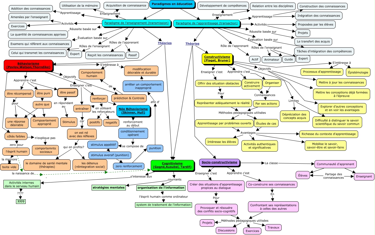 This Concept Map, created with IHMC CmapTools, has information related to: Module 3 alex, Représenter adéquatement la réalité Méthodes pédagogiques utilisées Études de cas, Communauté d'apprenant Enseignant, Offrir des situation obstacles Pour Représenter adéquatement la réalité, on est né avec des réflexes qui en profite? le domaine de santé mentale (thérapies), Confrontant ses représentations à celles des autres Méthodes pédagogiques utilisées Travaux, Béhaviorisme (Pavlov,Watson,Thorndike) Apprendre c'est être passif, Socio-constructivisme Apprendre c'est Co-construire ses connaissances, Paradigme de l'apprentissage (transaction) Théories Constructivisme (Piaget, Bruner), autre que Compoertement approprié, Confrontant ses représentations à celles des autres Méthodes pédagogiques utilisées Discussions, côtés faibles zero pour l'ésprit humain, renforçer en utilisant les reforçateurs entraîner, Constructivisme (Piaget, Bruner) Objectifs Mettre les conceptions déjà formées à l'épreuve, Paradigme de l'enseignement (transmission) Activités Amenées par l'enseignant, Études de cas Avantages Activités authentiques et significatives, Paradigme de l'apprentissage (transaction) Rôles de l'enseignant Expert, renforçer Néo Béhaviorisme (Skinner, Hull), Activités internes dans le serveau humain ???? ????, Confrontant ses représentations à celles des autres Méthodes pédagogiques utilisées Projets, Paradigme de l'apprentissage (transaction) Activités Projets