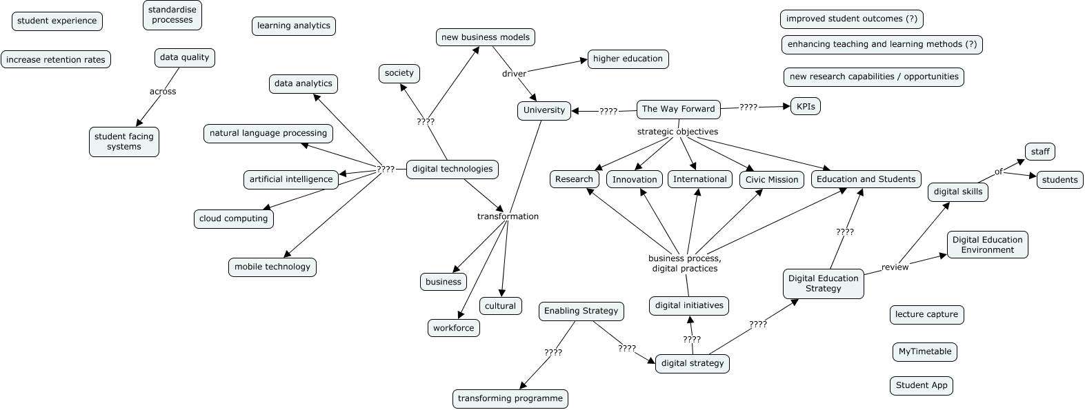 This Concept Map, created with IHMC CmapTools, has information related to: Digital Strategy, digital technologies transformation business, digital technologies transformation workforce, digital technologies ???? data analytics, The Way Forward strategic objectives Research, The Way Forward strategic objectives Civic Mission, digital initiatives business process, digital practices Civic Mission, digital technologies ???? natural language processing, digital technologies ???? cloud computing, digital strategy ???? digital initiatives, University transformation business, digital skills of staff, digital initiatives business process, digital practices Research, new business models driver higher education, Enabling Strategy ???? transforming programme, digital technologies ???? mobile technology, digital initiatives business process, digital practices Education and Students, Digital Education Strategy ???? Education and Students, Enabling Strategy ???? digital strategy, digital initiatives business process, digital practices International, digital technologies transformation cultural