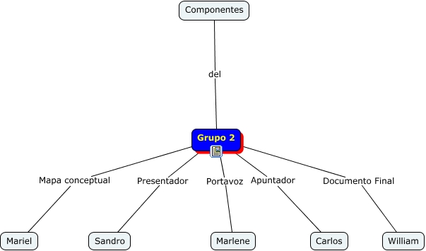 Este Cmap, tiene información relacionada con: ejemplo, Grupo 2 Portavoz Marlene, Grupo 2 Presentador Sandro, Grupo 2 Documento Final William, Grupo 2 Mapa conceptual Mariel, Grupo 2 Apuntador Carlos, Componentes del Grupo 2