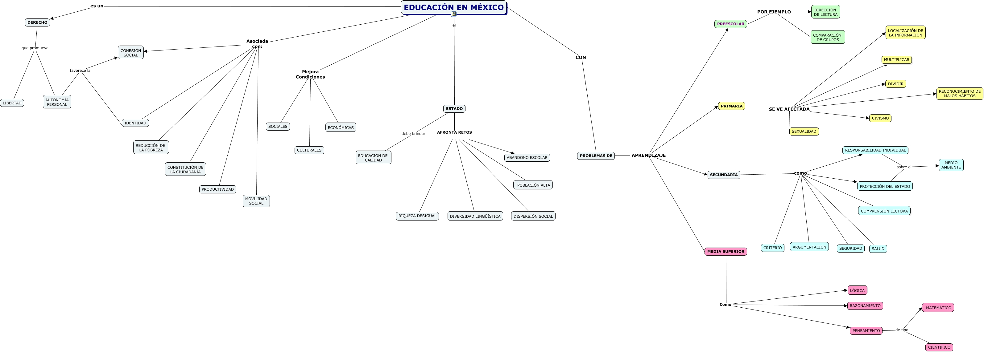 Este Cmap, tiene información relacionada con: EQUIPO-A. ESTADO ACTUAL DE LA EDUCACIÓN EN MÉXICO. 5.cmap.cmap.cmap, RESPONSABILIDAD INDIVIDUAL sobre el MEDIO AMBIENTE, EDUCACIÓN EN MÉXICO Mejora Condiciones SOCIALES, DERECHO que promueve AUTONOMÍA PERSONAL, AUTONOMÍA PERSONAL favorece la IDENTIDAD, PROBLEMAS DE APRENDIZAJE MEDIA SUPERIOR, ESTADO AFRONTA RETOS ABANDONO ESCOLAR, EDUCACIÓN EN MÉXICO Asociada con: COHESIÓN SOCIAL, ESTADO debe brindar EDUCACIÓN DE CALIDAD, ESTADO AFRONTA RETOS RIQUEZA DESIGUAL, ESTADO AFRONTA RETOS DIVERSIDAD LINGÜÍSTICA, DERECHO que promueve LIBERTAD, MEDIA SUPERIOR Como PENSAMIENTO, EDUCACIÓN EN MÉXICO Asociada con: CONSTITUCIÓN DE LA CIUDADANÍA, MEDIA SUPERIOR Como RAZONAMIENTO, PROBLEMAS DE APRENDIZAJE PRIMARIA, AUTONOMÍA PERSONAL favorece la COHESIÓN SOCIAL, ESTADO AFRONTA RETOS DISPERSIÓN SOCIAL, EDUCACIÓN EN MÉXICO Mejora Condiciones ECONÓMICAS, SECUNDARIA como SALUD, PREESCOLAR POR EJEMPLO DIRECCIÓN DE LECTURA
