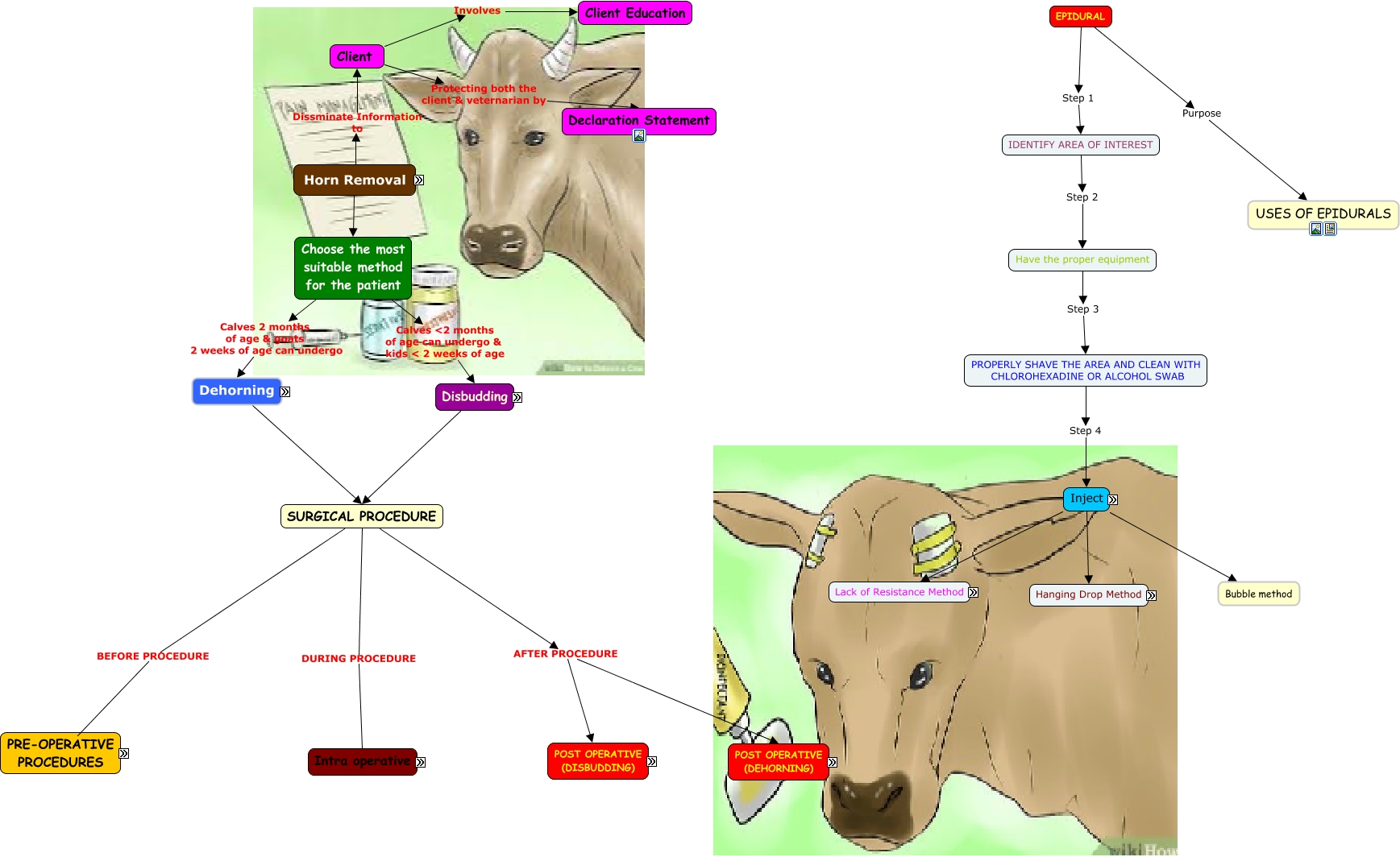 This Concept Map, created with IHMC CmapTools, has information related to: Cmap Lab 2 Dehorning, EMERGENCY DRUGS ATROPINE, 5-10 MINUTES NOW PROCEED WITH INTRA OPERATIVE PROCEDURE, SECOND NERVE BLOCK IF THERE IS FAILURE OF SECOND NERVE BLOCK SEDATIVE IV, Steps to take Callicrate bander, PROPERLY SHAVE THE AREA AND CLEAN WITH CHLOROHEXADINE OR ALCOHOL SWAB Step 4 Inject, Client Involves Client Education, Chemical Method Reasons against Disadvantages, RESTRAIN ANIMAL FOLLOWED BY PHYSICAL EXAM + HISTORY TAKING, ANTIBIOTICS FOLLOWED BY NERVE BLOCKS, Mechanical Methods Gigli Wire, EMERGENCY DRUGS TOLAZOLINE, POST OPERATIVE OF CALF 275(DEHORNING) DAY 3, SURGICAL PROCEDURE DURING PROCEDURE Intra operative, APPLY ONE OR TWO DROPS INTO HUB OFF NEEDLE FROM THE SYRINGE IF THERE IS NEGATIVE PRESSURE , THE FLUID WILL BE SUCKED DOWN INTO THE SPACE, Choose the most suitable method for the patient Calves 2 months of age & goats 2 weeks of age can undergo Dehorning, ANTIBIOTICS LETHAL DOSE PENICILLIN + STREPTOMYCIN, EMERGENCY DRUGS EPINEPHRINE, Mechanical Methods Dehorning Spoons, Cups & Tubes, POST OPERATIVE OF CALF 275(DEHORNING) DAY 1, Mechanical Method Done with Hot Iron/ Electrothermal