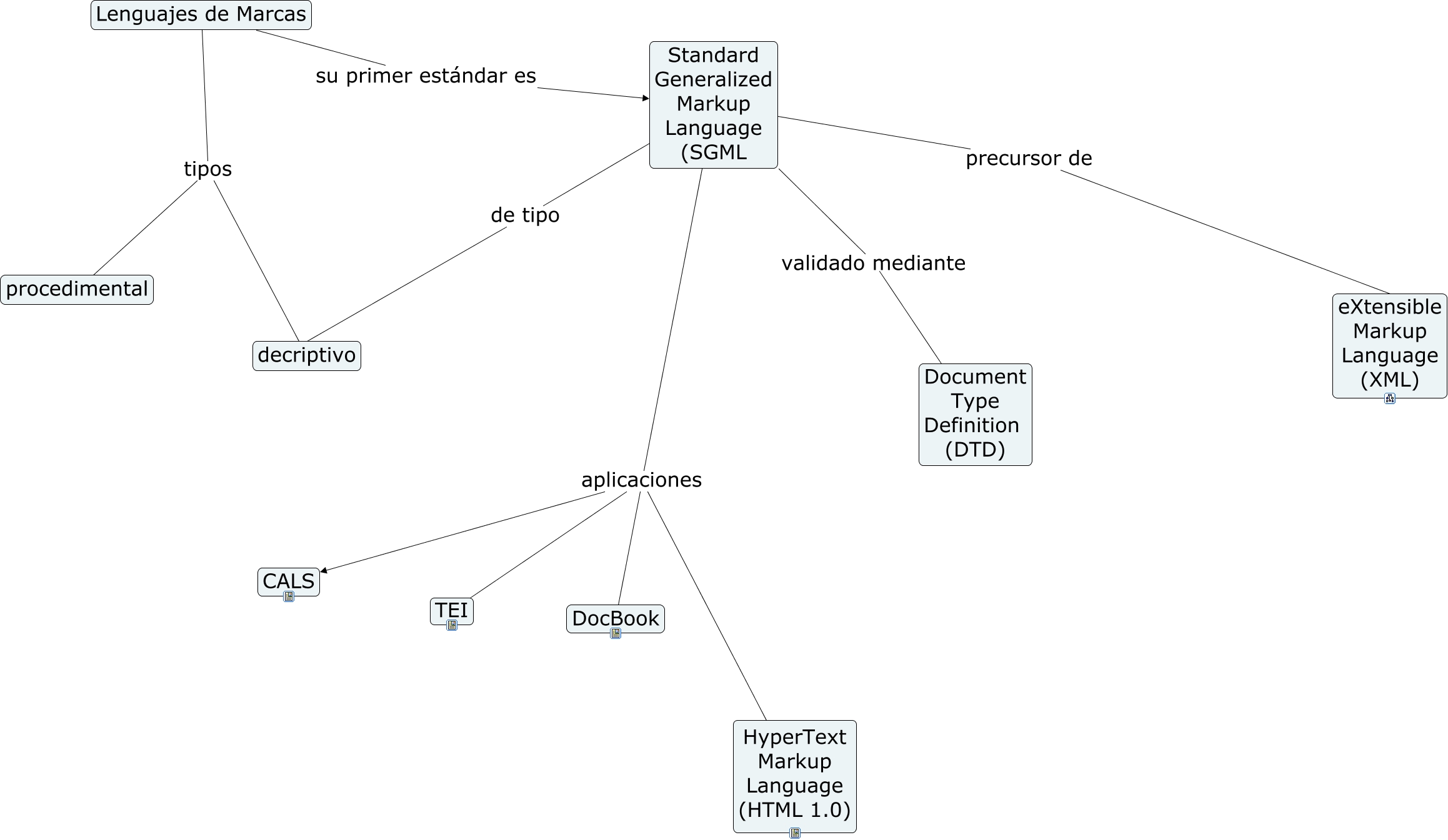 Este Cmap, tiene información relacionada con: LenguajeMarcas, Standard Generalized Markup Language (SGML aplicaciones DocBook, Standard Generalized Markup Language (SGML validado mediante Document Type Definition (DTD), Lenguajes de Marcas tipos decriptivo, Standard Generalized Markup Language (SGML aplicaciones CALS, Standard Generalized Markup Language (SGML aplicaciones HyperText Markup Language (HTML 1.0), Standard Generalized Markup Language (SGML aplicaciones TEI, Lenguajes de Marcas su primer estándar es Standard Generalized Markup Language (SGML, Lenguajes de Marcas tipos procedimental, Standard Generalized Markup Language (SGML de tipo decriptivo, Standard Generalized Markup Language (SGML precursor de eXtensible Markup Language (XML)