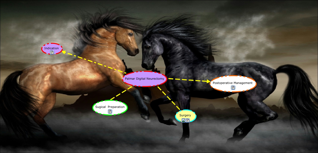 This Concept Map, created with IHMC CmapTools, has information related to: palmar digital neurectomy, Palmar Digital Neurectomy ???? Postoperative Management, Palmar Digital Neurectomy ???? Surgery, Palmar Digital Neurectomy ???? Indication, Palmar Digital Neurectomy ???? Sugical Preparation