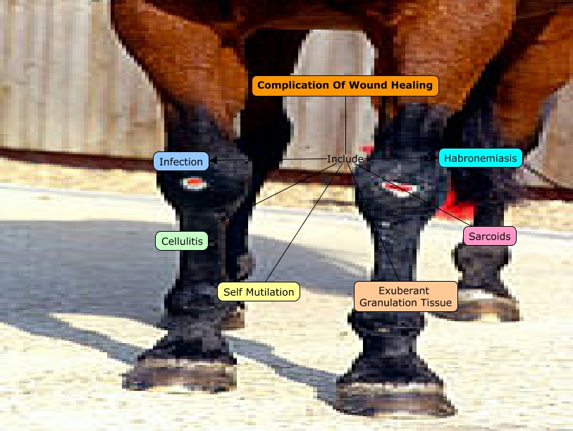 This Concept Map, created with IHMC CmapTools, has information related to: Wound Complications, Complication Of Wound Healing Include Habronemiasis, Complication Of Wound Healing Include Infection, Complication Of Wound Healing Include Cellulitis, Complication Of Wound Healing Include Self Mutilation, Complication Of Wound Healing Include Sarcoids, Complication Of Wound Healing Include Exuberant Granulation Tissue
