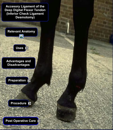 This Concept Map, created with IHMC CmapTools, has information related to: Inferior Check Ligament Desmotomy, Preparation divided into Site Preparation, Permits effective lengthening of the deep digital flexor tendon and axial realignment of the distal limb. Useful in cases of ALDDFT or DDFT tendinitis, Preparation divided into Pre-medication, Permits effective lengthening of the deep digital flexor tendon and axial realignment of the distal limb. Useful in cases of Chronic Laminitis with subsequent rotation of the distal phalanx, Preparation divided into Other considerations, Permits effective lengthening of the deep digital flexor tendon and axial realignment of the distal limb. Useful in cases of Flexural Deformities of the Distal Interphalangeal Joint (Club Foot), Preparation divided into Restraint (GA)