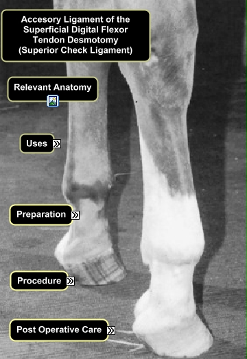 This Concept Map, created with IHMC CmapTools, has information related to: Superior Check Ligament Desmotomy, Preparation (mouse overs) divided into Pre-medication, Preparation (mouse overs) divided into Other considerations, Desmotomy permits lengthening of the SDF muscle/tendon unit and/or allows the belly of the SDF muscle to take a greater proportion of the load, serving to protect a repaired SDFT. useful in cases of Flexural Deformity of the Fetlock Joint, Preparation (mouse overs) divided into Restraint (GA), Preparation (mouse overs) divided into Site Preparation, Desmotomy permits lengthening of the SDF muscle/tendon unit and/or allows the belly of the SDF muscle to take a greater proportion of the load, serving to protect a repaired SDFT. useful in cases of SDFT tendonitis
