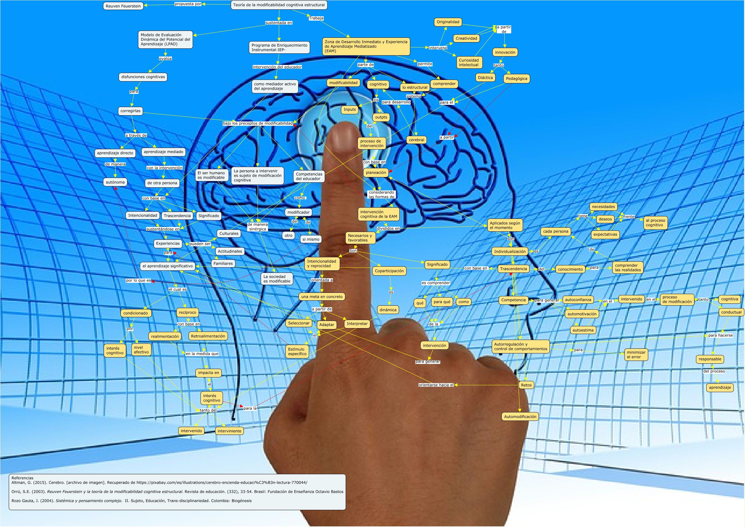Este Cmap, tiene información relacionada con: t_cognitiva_estructural, conocimiento para comprender las realidades, necesidades frente al proceso cognitivo, Originalidad a partir de innovación, Necesarios y favorables Son Coparticipación, impacta en el interés cognitivo, Trascendencia del conocimiento, de otra persona con base en Trascendencia, Teoría de la modificabilidad cognitiva estructural Trabaja Zona de Desarrollo Inmediato y Experiencia de Aprendizaje Mediatizado (EAM), Trascendencia con base en el aprendizaje significativo, disfunciones cognitivas para corregirlas, como mediador activo del aprendizaje con base en Significado, Aplicados según el momento son Competencia, el aprendizaje significativo el cual es recíproco, dinámica tanto del interviniente, Competencia para generar autoconfianza, Zona de Desarrollo Inmediato y Experiencia de Aprendizaje Mediatizado (EAM) intervene Curiosidad intelectual, corregirlas a través de aprendizaje directo, una meta en concreto a partir de Interpretar, Autorregulación y control de comportamientos para minimizar el error, Autorregulación y control de comportamientos para hacerse responsable