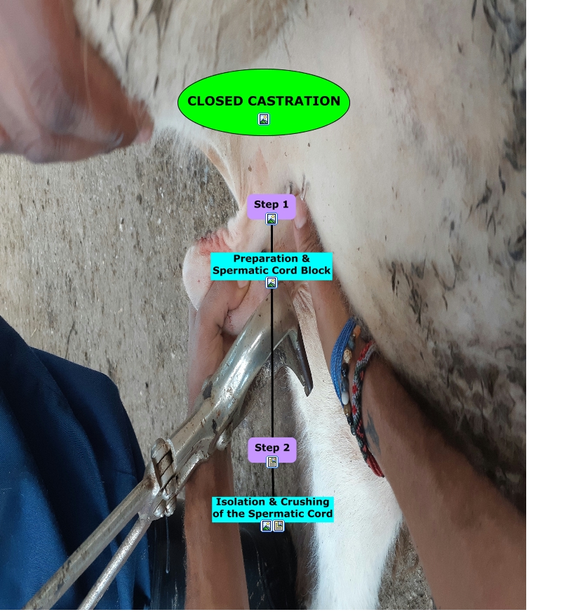 This Concept Map, created with IHMC CmapTools, has information related to: Closed Castration, Step 1 Preparation & Spermatic Cord Block Step 2, Step 2 Isolation & Crushing of the Spermatic Cord, Step 1 Preparation & Spermatic Cord Block Step 2