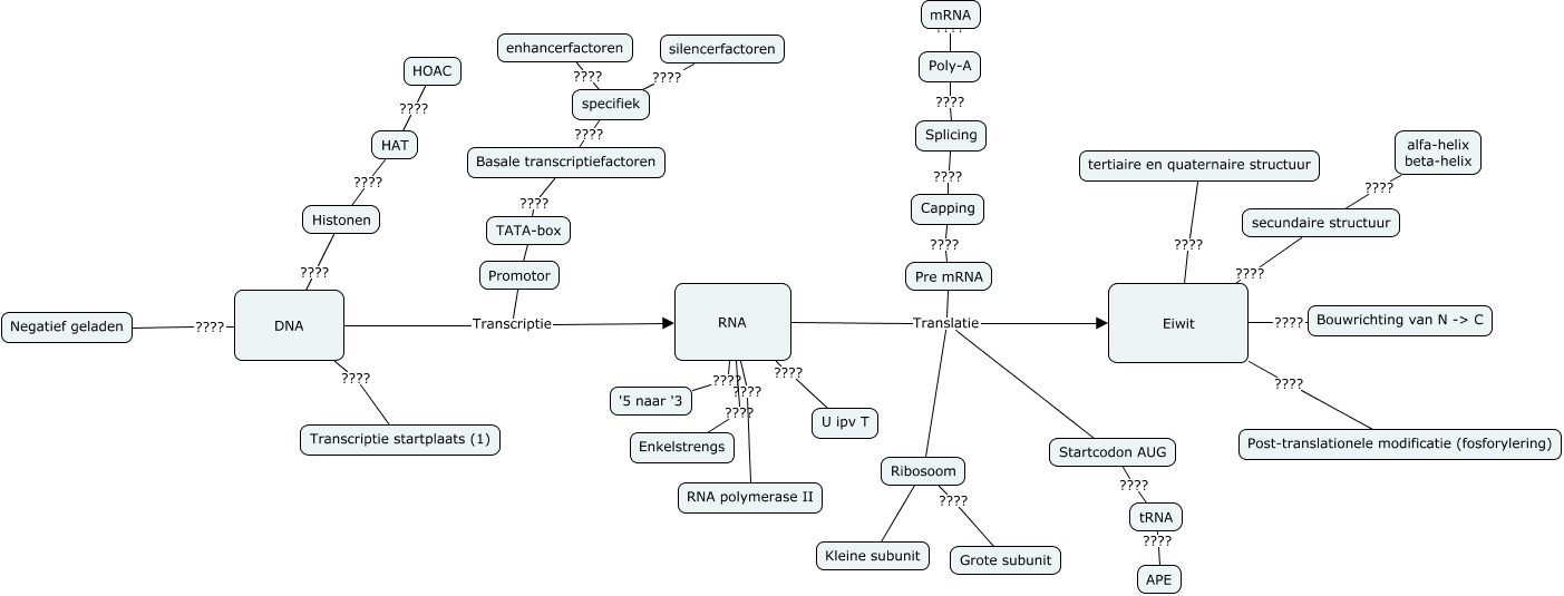 Deze Concept Map heeft informatie gerelateerd aan: Proef 1, RNA Translatie Pre mRNA, Eiwit ???? Bouwrichting van N -> C, HAT ???? HOAC, Ribosoom ???? Grote subunit, Eiwit ???? secundaire structuur, Splicing ???? Poly-A, DNA ???? Histonen, TATA-box ???? Basale transcriptiefactoren, Negatief geladen ???? DNA, secundaire structuur ???? alfa-helix beta-helix, Basale transcriptiefactoren ???? specifiek, RNA Translatie Eiwit, RNA Translatie Startcodon AUG, Pre mRNA ???? Capping, RNA Translatie Ribosoom, Promotor ???? TATA-box, Eiwit ???? Post-translationele modificatie (fosforylering), Startcodon AUG ???? tRNA, Capping ???? Splicing, Ribosoom ???? Kleine subunit