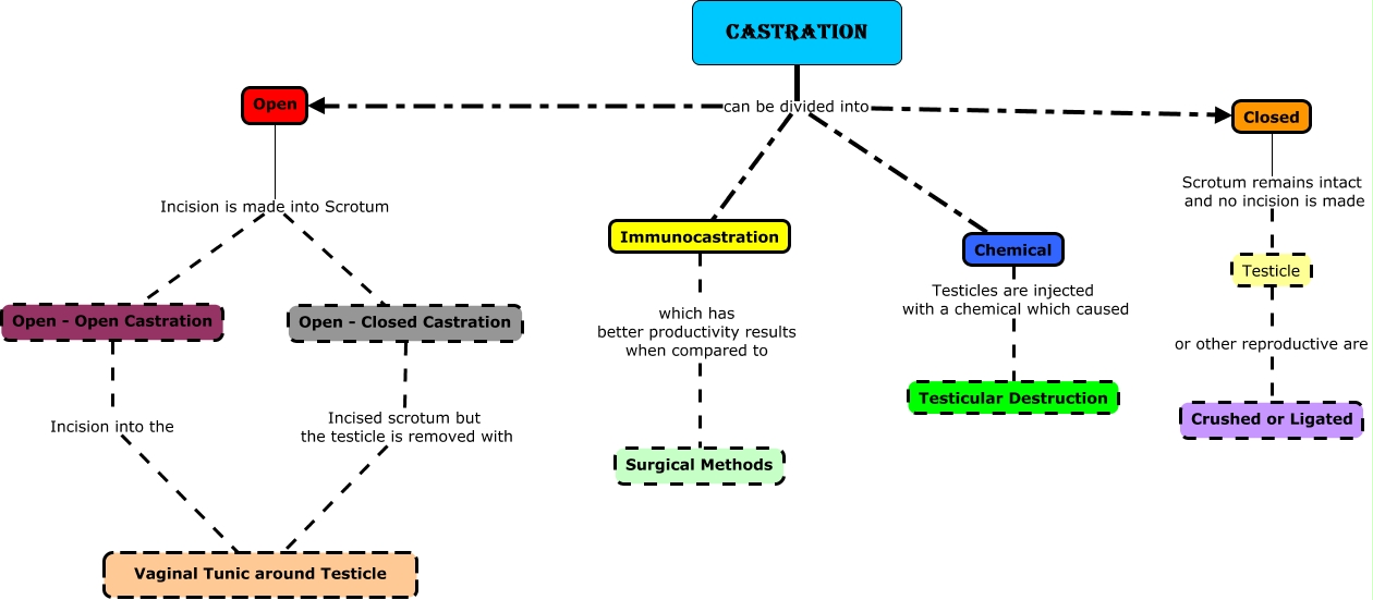 This Concept Map, created with IHMC CmapTools, has information related to: Castration, Chemical Testicles are injected with a chemical which caused Testicular Destruction, Castration can be divided into Open, Immunocastration which has better productivity results when compared to Surgical Methods, Open - Open Castration Incision into the Vaginal Tunic around Testicle, Closed Scrotum remains intact and no incision is made Testicle, Open - Closed Castration Incised scrotum but the testicle is removed with Vaginal Tunic around Testicle, Open Incision is made into Scrotum Open - Open Castration, Open Incision is made into Scrotum Open - Closed Castration, Testicle or other reproductive are Crushed or Ligated, Castration can be divided into Closed, Castration can be divided into Immunocastration, Castration can be divided into Chemical