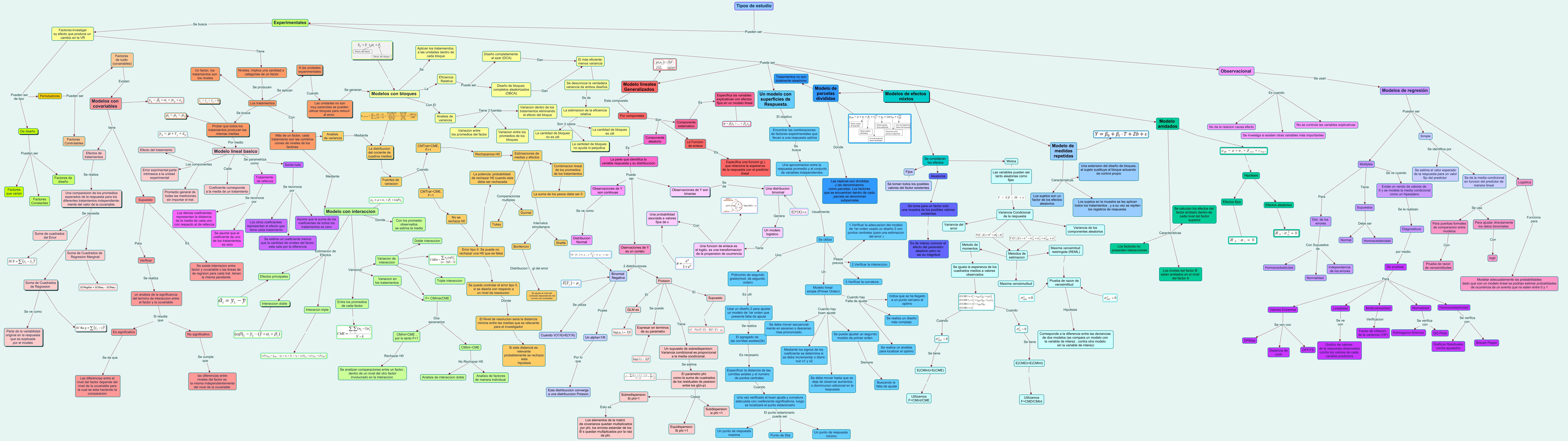 Este Cmap, tiene información relacionada con: Estadistica, Estimaciones de medias y efectos Intervalos simultaneos Bonferroni, Analisis de variancia Tiene 3 fuentes Variacion entre los promedios del factor, Poisson El Supuesto, Suma nula Se reconoce por Asume que la suma de los coeficientes de todos los tratamientos es cero, Observaciones de Y son continuas Se ve como Distribucion Normal, Variancia Condicional de la respuesta Metodos de estimacion, Modelos de regresión Pueden ser Logistica, Modelo con interaccion Estimacion de Efectos Efectos principales, Suma nula Se reconoce por Se estima un coeficiente menos que la cantidad de niveles del factor, este sale por la diferencia, Más de un factor, cada tratamiento son las combina- ciones de niveles de los factores Analisis de variancia, Se utiliza Un Modelo lineal simple (Primer Orden), Binomial Negativa Posee Un alpha=1/K, Simple Se identifica por Se estima el valor esperado de la respuesta para un valor fijo del predictor, Hipotesis Efectos aleatorios, El parametro phi: como la suma de cuadrados de los residuales de pearson entre los gl(n-p) Casos Subdispersion: si phi ə, F= CMInte/CME Dos escenarios CMInt>CME , por lo tanto Fɭ, La estimacion de la eficiencia relativa Son 3 casos La cantidad de bloques no ayuda ni perjudica, La Funcion de enlace Es Especifica una funcion g(.) que relaciona la esperanza de la respuesta con el predictor lineal, Tipos de estudio Pueden ser Experimentales, Componente aleatorio Es La parte que identifica la variable respuesta y su distribuccion