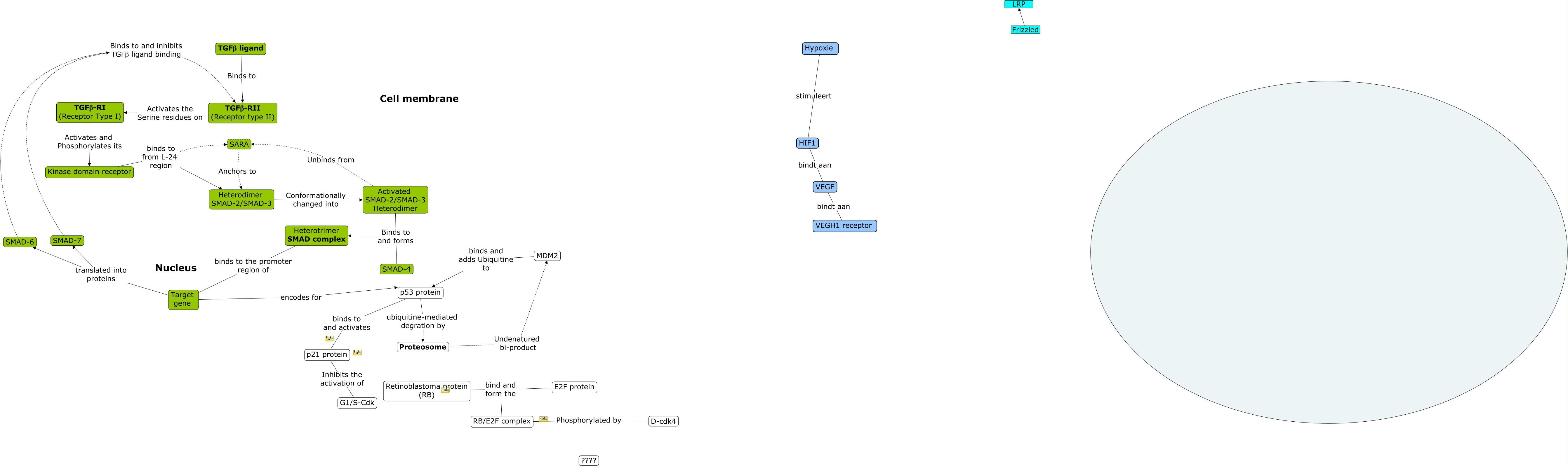 Deze Concept Map heeft informatie gerelateerd aan: Cmap 1, VEGF bindt aan VEGH1 receptor, Kinase domain receptor binds to from L-24 region Heterodimer SMAD-2/SMAD-3, RB/E2F complex Phosphorylated by D-cdk4, Target gene translated into proteins SMAD-6, SMAD-7 Binds to and inhibits TGFβ ligand binding TGFβ-RII (Receptor type II), Target gene translated into proteins SMAD-7, TGFβ-RII (Receptor type II) Activates the Serine residues on TGFβ-RI (Receptor Type I), Hypoxie stimuleert HIF1, SARA Anchors to Heterodimer SMAD-2/SMAD-3, Proteosome Undenatured bi-product MDM2, TGFβ-RI (Receptor Type I) Activates and Phosphorylates its Kinase domain receptor, Retinoblastoma protein (RB) bind and form the RB/E2F complex, Kinase domain receptor binds to from L-24 region SARA, Activated SMAD-2/SMAD-3 Heterodimer Binds to and forms SMAD-4, Retinoblastoma protein (RB) bind and form the E2F protein, p53 protein binds to and activates p21 protein, p21 protein Inhibits the activation of G1/S-Cdk, RB/E2F complex Phosphorylated by ????, HIF1 bindt aan VEGF, Heterotrimer SMAD complex binds to the promoter region of Target gene