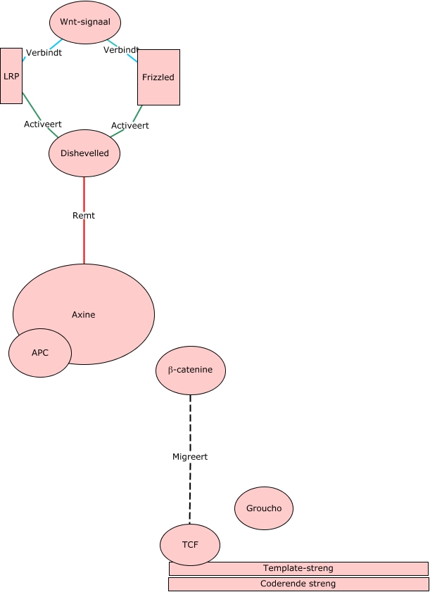 Deze Concept Map heeft informatie gerelateerd aan: WNT pathway, β-catenine Migreert TCF, Wnt-signaal Verbindt Frizzled, LRP Activeert Dishevelled, Wnt-signaal Verbindt LRP, Frizzled Activeert Dishevelled, Dishevelled Remt GSK 3β