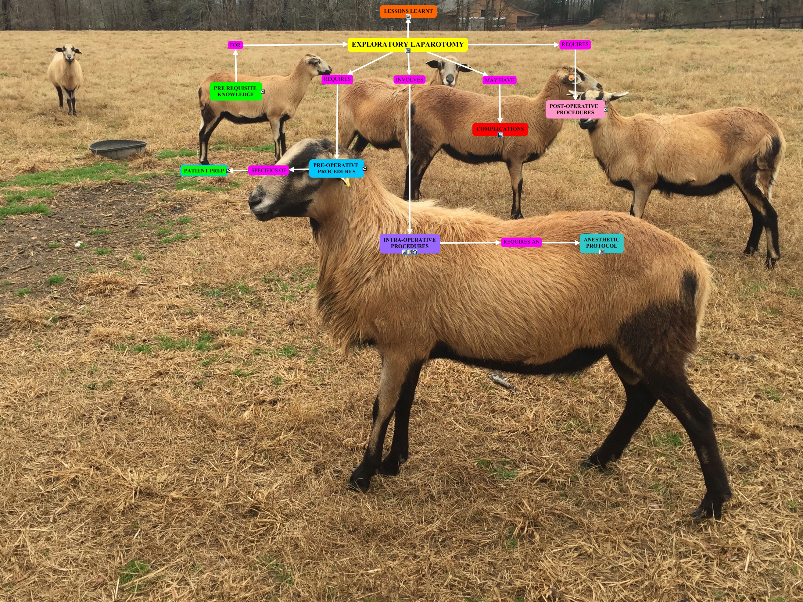 This Concept Map, created with IHMC CmapTools, has information related to: Lab 8 - Sheep Exploratory Laparotomy, EXPLORATORY LAPAROTOMY LESSONS LEARNT, STERILE SKIN PREP then DRAPING, INTRA-OPERATIVE PROCEDURES REQUIRES AN ANESTHETIC PROTOCOL, EXPLORATORY LAPAROTOMY MAY HAVE COMPLICATIONS, EXPLORATORY LAPAROTOMY INVOLVES INTRA-OPERATIVE PROCEDURES, RESTRAINT MAY BE PHYSICAL, PRE-OPERATIVE PROCEDURES SPECIFICS OF PATIENT PREP, RESTRAINT MAY BE CHEMICAL, PRE REQUISITE KNOWLEDGE FOR EXPLORATORY LAPAROTOMY, SHAVING then SURGICAL SCRUB, EXPLORATORY LAPAROTOMY REQUIRES POST-OPERATIVE PROCEDURES, SURGICAL SCRUB then STERILE SKIN PREP, EXPLORATORY LAPAROTOMY REQUIRES PRE-OPERATIVE PROCEDURES