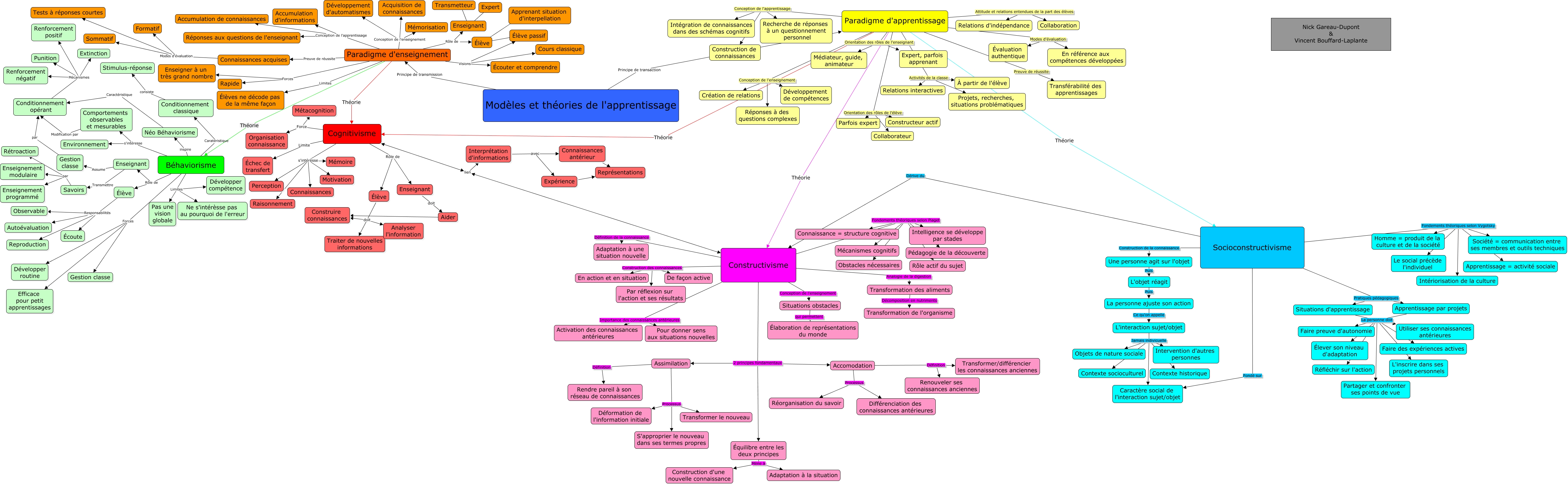 This Concept Map, created with IHMC CmapTools, has information related to: TP3, Constructivisme 2 principes fondamentaux Assimilation, Béhaviorisme Limites Ne s'intérèsse pas au pourquoi de l'erreur, Socioconstructivisme Pratiques pédagogiques Situations d'apprentissage, Expérience ???? Représentations, Constructivisme Fondements théoriques selon Piaget Connaissance = structure cognitive, Paradigme d'apprentissage Conception de l'enseignement Création de relations, Socioconstructivisme Fondements théoriques selon Vygotsky Le social précède l'individuel, Situations d'apprentissage La personne doit Utiliser ses connaissances antérieures, L'interaction sujet/objet Jamais indivicuelle Objets de nature sociale, Paradigme d'enseignement Conception de l'enseignement Mémorisation, L'interaction sujet/objet Jamais indivicuelle Caractère social de l'interaction sujet/objet, Paradigme d'apprentissage Orientation des rôles de l'enseignant Expert, parfois apprenant, Constructivisme Fondements théoriques selon Piaget Obstacles nécessaires, Constructivisme Construction des connaissances En action et en situation, Paradigme d'enseignement Rôle de Élève, Cognitivisme Force Métacognition, Paradigme d'apprentissage Orientation des rôles de l'élève Collaborateur, Paradigme d'apprentissage Activités de la classe À partir de l'élève, Paradigme d'apprentissage Conception de l'apprentissage Construction de connaissances, Béhaviorisme Limites Pas une vision globale