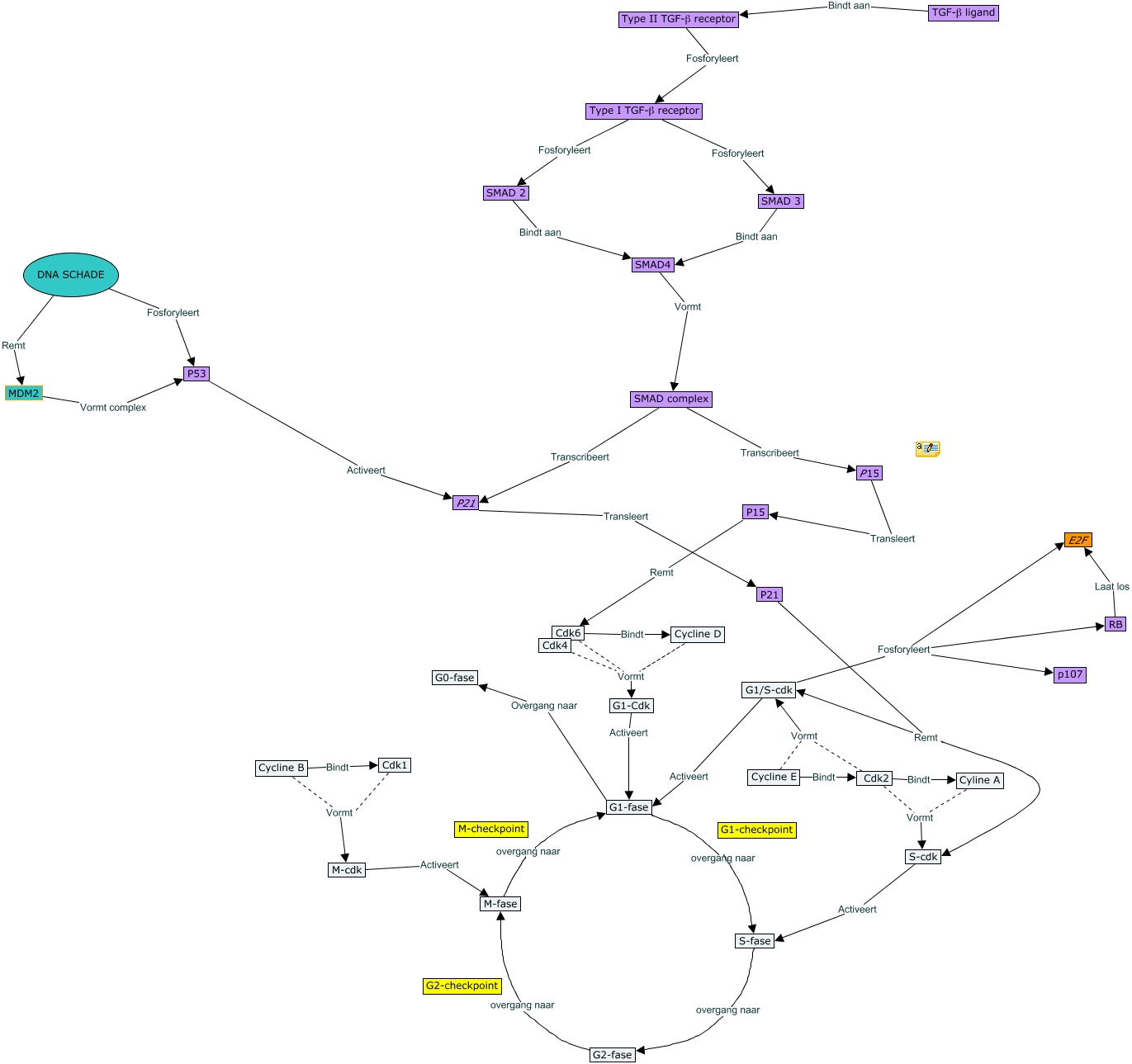 This Concept Map, created with IHMC CmapTools, has information related to: celcyclus en TGF-B pathway, SMAD 2 Bindt aan SMAD4, RB Laat los E2F, P15 Remt Cdk6, Cycline E Bindt Cdk2, P21 Transleert P21, SMAD 3 Bindt aan SMAD4, SMAD complex Transcribeert P21, P21 Remt S-cdk, G1/S-cdk Activeert G1-fase, SMAD complex Transcribeert P15, Cdk4 Vormt G1-Cdk, G1-fase Overgang naar G0-fase, S-fase overgang naar G2-fase, DNA SCHADE Remt MDM2, Cdk1 Vormt M-cdk, Cyline A Vormt S-cdk, Cycline D Vormt G1-Cdk, Cycline B Bindt Cdk1, Type I TGF-β receptor Fosforyleert SMAD 2, G1-fase overgang naar S-fase