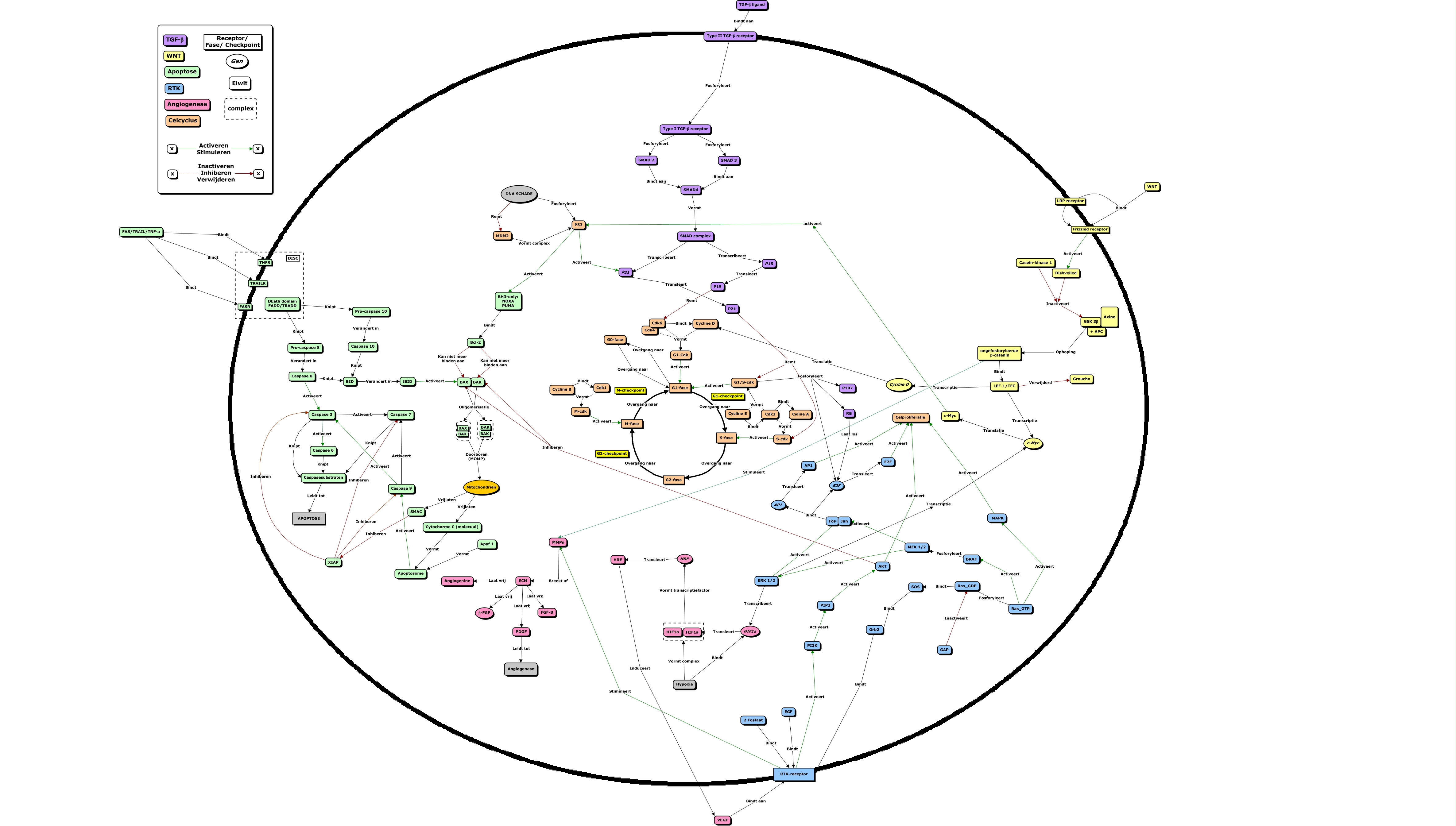 Deze Concept Map heeft informatie gerelateerd aan: Cmap totaal, Pro-caspase 10 Verandert in Caspase 10, ECM Laat vrij Angiogenine, P21 Remt G1/S-cdk, BAX Oligomerisatie, Caspase 3 Activeert Caspase 6, Ras_GTP Activeert MAPK, Caspase 6 Knipt Caspasesubstraten, S-cdk Activeert S-fase, G1/S-cdk Activeert G1-fase, Cycline B Bindt Cdk1, Bcl-2 Kan niet meer binden aan BAK, P15 Transleert P15, Fos Bindt E2F, Mitochondriën Vrijlaten SMAC, G1/S-cdk Fosforyleert P107, WNT Bindt Frizzled receptor, Caspase 8 Knipt BID, S-fase Overgang naar G2-fase, PIP3 Activeert AKT, Frizzled receptor Activeert Dishvelled