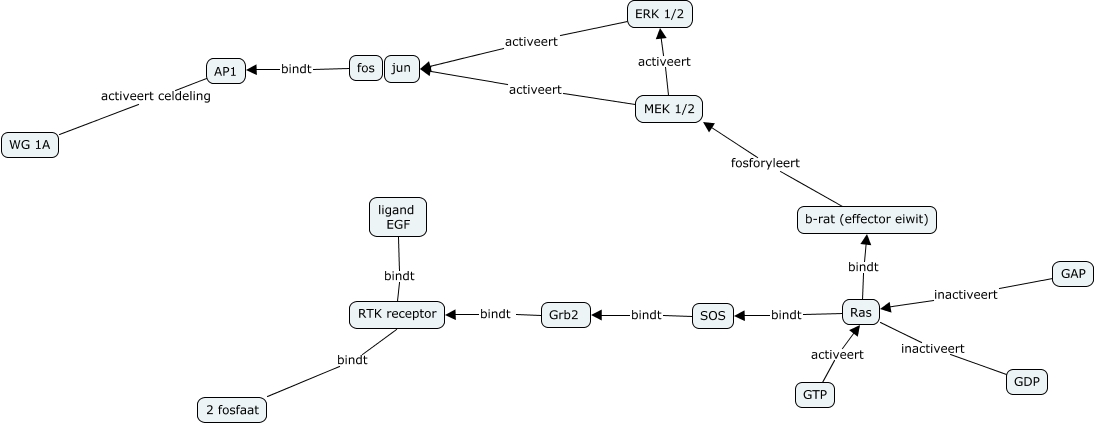 Deze Concept Map heeft informatie gerelateerd aan: RTK pathway, Ras bindt b-rat (effector eiwit), ligand EGF bindt RTK receptor, ERK 1/2 activeert jun, SOS bindt Grb2, fos bindt AP1, AP1 activeert celdeling WG 1A, GTP activeert Ras, RTK receptor bindt 2 fosfaat, Ras inactiveert GDP, Grb2 bindt RTK receptor, MEK 1/2 activeert ERK 1/2, GAP inactiveert Ras, b-rat (effector eiwit) fosforyleert MEK 1/2, MEK 1/2 activeert jun, Ras bindt SOS