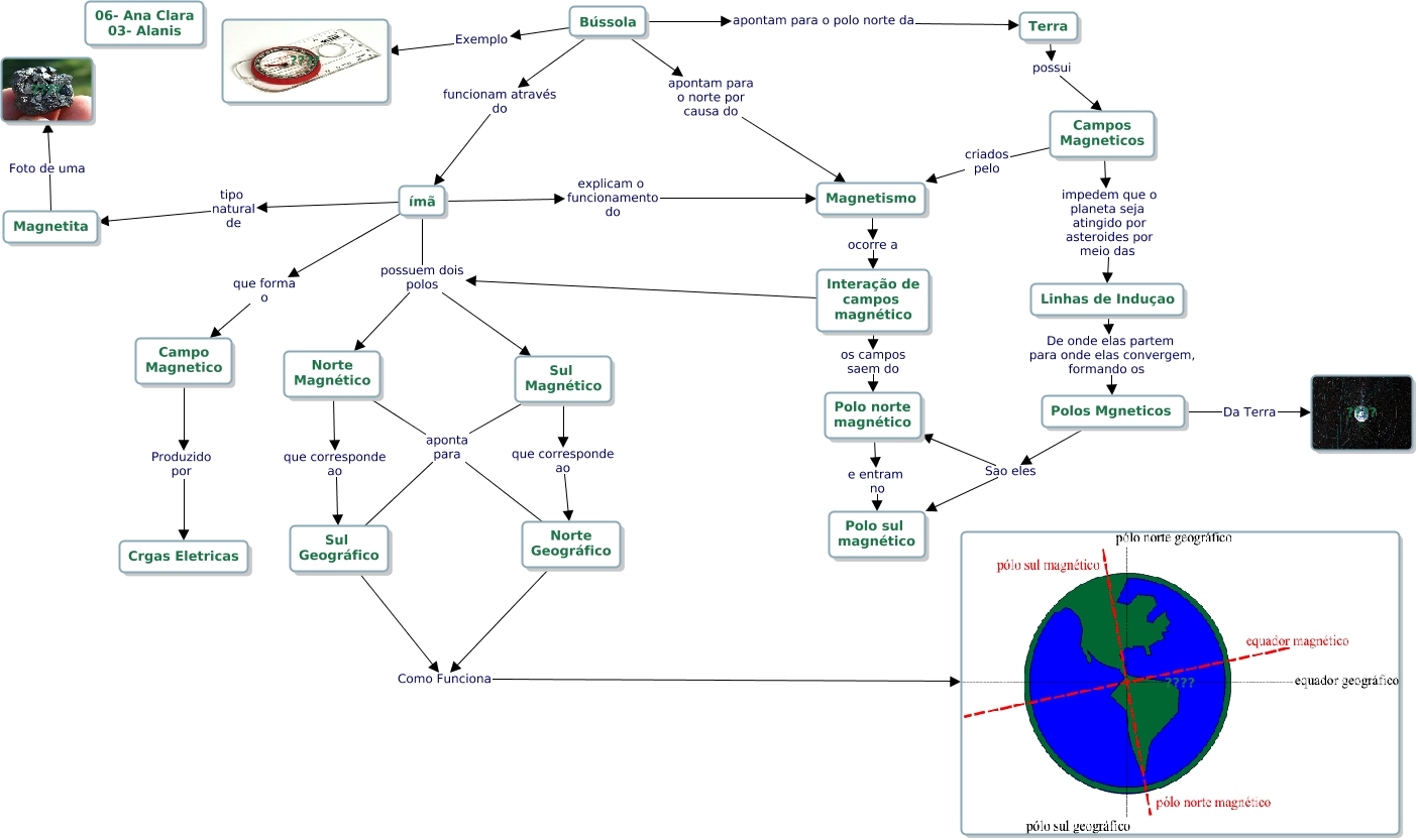 Esse mapa conceitual, produzido no IHMC CmapTools, tem a informação relacionada a: 03- Alanis 06- Ana Clara, Sul Magnético aponta para Norte Geográfico, Interação de campos magnético os campos saem do Polo norte magnético, ímã que forma o Campo Magnetico, Linhas de Induçao De onde elas partem para onde elas convergem, formando os Polos Mgneticos, Interação de campos magnético possuem dois polos Norte Magnético, Polos Mgneticos Sao eles Polo norte magnético, Bússola apontam para o norte por causa do Magnetismo, Polo norte magnético e entram no Polo sul magnético, Sul Magnético que corresponde ao Norte Geográfico, Bússola funcionam através do ímã, Norte Magnético que corresponde ao Sul Geográfico, Campos Magneticos impedem que o planeta seja atingido por asteroides por meio das Linhas de Induçao, Bússola apontam para o polo norte da Terra, Sul Geográfico Como Funciona ????, ímã possuem dois polos Sul Magnético, Polos Mgneticos Da Terra ????, ímã possuem dois polos Norte Magnético, Norte Geográfico Como Funciona ????, ímã explicam o funcionamento do Magnetismo, Bússola Exemplo ????