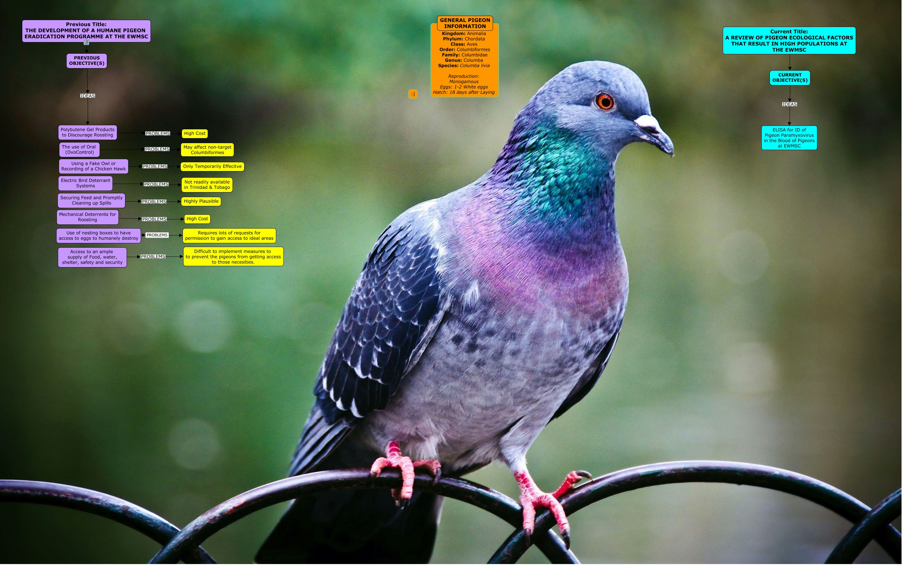 This Concept Map, created with IHMC CmapTools, has information related to: Progression of Ideas, Mechanical Deterrents for Roosting PROBLEMS High Cost, Electric Bird Deterrant Systems PROBLEMS Not readily available in Trinidad & Tobago, Current Title: A REVIEW OF PIGEON ECOLOGICAL FACTORS THAT RESULT IN HIGH POPULATIONS AT THE EWMSC CURRENT OBJECTIVE(S), Use of nesting boxes to have access to eggs to humanely destroy ???? PROBLEMS, CURRENT OBJECTIVE(S) IDEAS ELISA for ID of Pigeon Paramyxovirus in the Blood of Pigeons at EWMSC, Using a Fake Owl or Recording of a Chicken Hawk PROBLEMS Only Temporarily Effecitve, The use of Oral (OvoControl) PROBLEMS May affect non-target Columbiformes, Previous Title: THE DEVELOPMENT OF A HUMANE PIGEON ERADICATION PROGRAMME AT THE EWMSC PREVIOUS OBJECTIVE(S), Access to an ample supply of Food, water, shelter, safety and security PROBLEMS Difficult to implement measures to to prevent the pigeons from getting access to those necesities., PREVIOUS OBJECTIVE(S) IDEAS Polybutene Gel Products to Discourage Roosting, Polybutene Gel Products to Discourage Roosting PROBLEMS High Cost, PROBLEMS Requires lots of requests for permission to gain access to ideal areas, Securing Feed and Promptly Cleaning up Spills PROBLEMS Highly Plausible