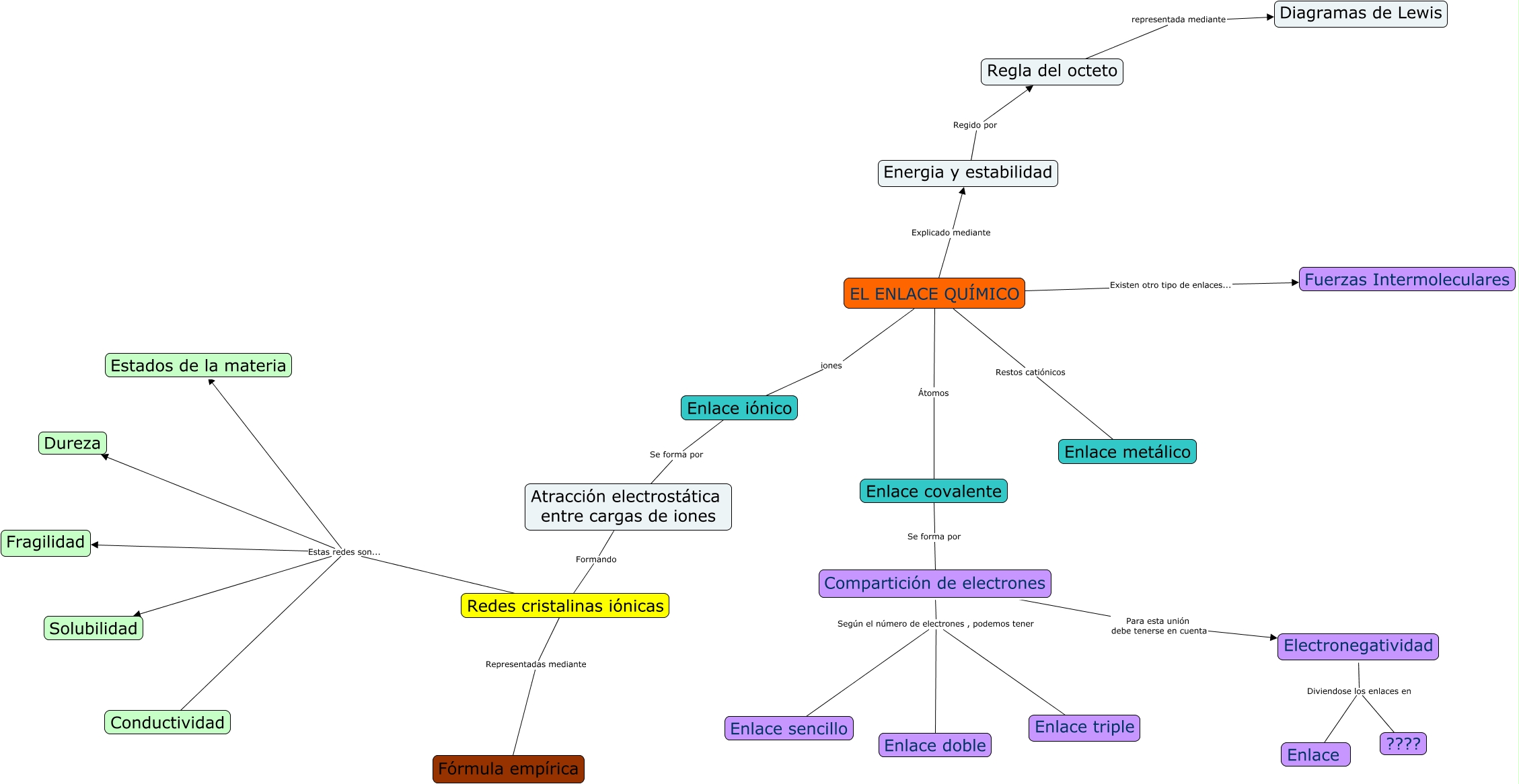 Este Cmap, tiene información relacionada con: ESCALADEPAULING, EL ENLACE QUÍMICO iones Enlace iónico, EL ENLACE QUÍMICO Existen otro tipo de enlaces... Fuerzas Intermoleculares, Regla del octeto representada mediante Diagramas de Lewis, EL ENLACE QUÍMICO Átomos Enlace covalente, EL ENLACE QUÍMICO Explicado mediante Energia y estabilidad, Energia y estabilidad Regido por Regla del octeto, Redes cristalinas iónicas Estas redes son... Conductividad, Enlace covalente Se forma por Compartición de electrones, Redes cristalinas iónicas Estas redes son... Fragilidad, Enlace iónico Se forma por Atracción electrostática entre cargas de iones, Electronegatividad Diviendose los enlaces en ????, Compartición de electrones Según el número de electrones , podemos tener Enlace sencillo, Atracción electrostática entre cargas de iones Formando Redes cristalinas iónicas, Electronegatividad Diviendose los enlaces en Enlace, Compartición de electrones Según el número de electrones , podemos tener Enlace triple, Redes cristalinas iónicas Estas redes son... Solubilidad, Redes cristalinas iónicas Estas redes son... Estados de la materia, EL ENLACE QUÍMICO Restos catiónicos Enlace metálico, Compartición de electrones Para esta unión debe tenerse en cuenta Electronegatividad, Compartición de electrones Según el número de electrones , podemos tener Enlace doble