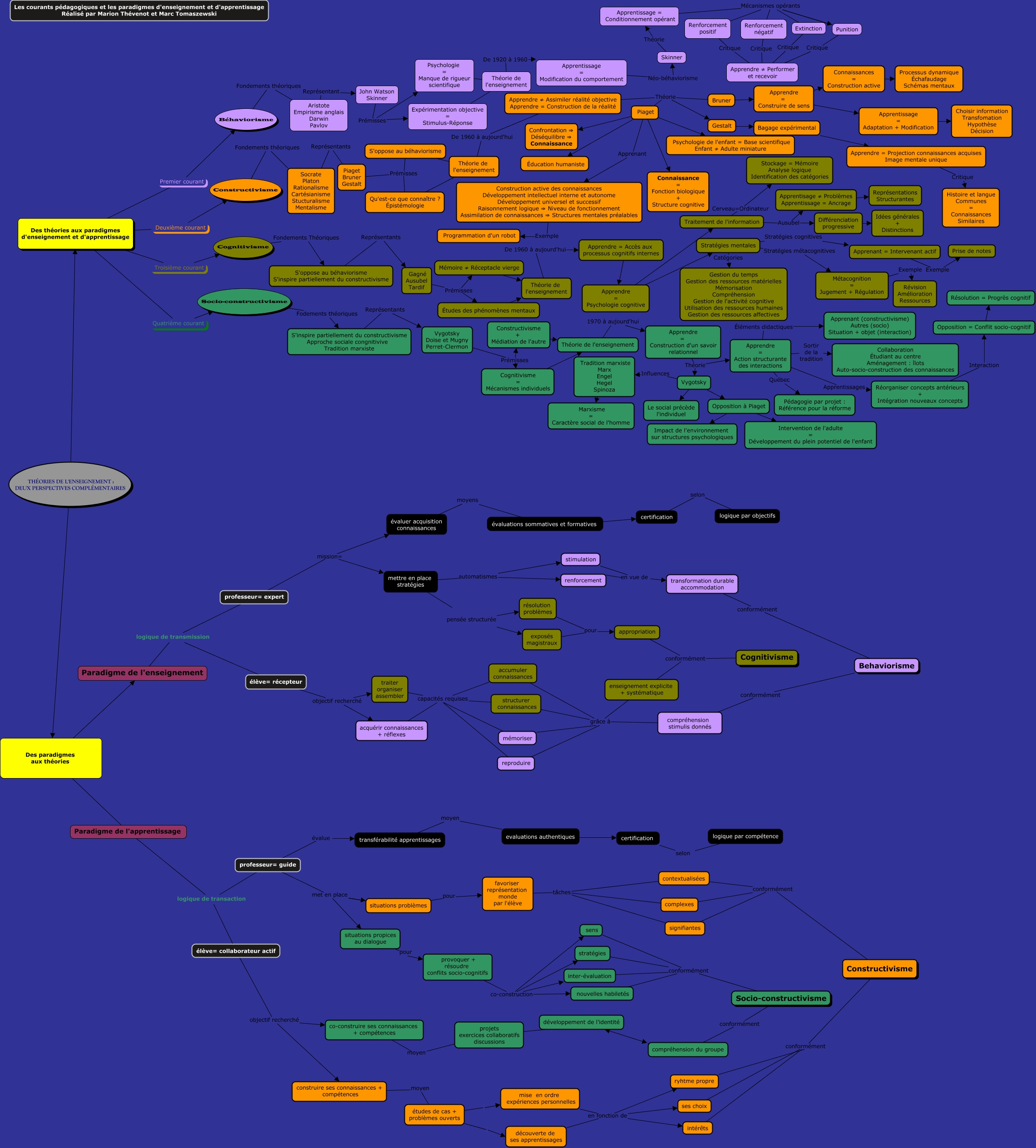 Cette carte de concepts créée avec IHMC CmapTools traite de: Proposition.cmap, Des théories aux paradigmes d'enseignement et d'apprentissage Premier courant Béhaviorisme, Opposition à Piaget Intervention de l'adulte = Développement du plein potentiel de l'enfant, Vygotsky Influences Tradition marxiste Marx Engel Hegel Spinoza, appropriation conformément enseignement explicite + systématique, Apprentissage = Conditionnement opérant Mécanismes opérants Renforcement positif, Apprendre = Construction d'un savoir relationnel Théorie Apprendre = Action structurante des interactions, Théorie de l'enseignement De 1960 à aujourd'hui Apprendre ≠ Assimiler réalité objective Apprendre = Construction de la réalité, Études des phénomènes mentaux Théorie de l'enseignement, ryhtme propre conformément Constructivisme, découverte de ses apprentissages en fonction de intérêts, Des paradigmes aux théories Paradigme de l'apprentissage, Métacognition = Jugement + Régulation Exemple Révision Amélioration Ressources, Stratégies mentales Stratégies métacognitives Métacognition = Jugement + Régulation, traiter organiser assembler capacités requises mémoriser, favoriser représentation monde par l'élève tâches complexes, traiter organiser assembler capacités requises reproduire, Apprentissage = Adaptation + Modification Choisir information Transfomation Hypothèse Décision, évaluer acquisition connaissances moyens évaluations sommatives et formatives, THÉORIES DE L'ENSEIGNEMENT : DEUX PERSPECTIVES COMPLÉMENTAIRES Des paradigmes aux théories, nouvelles habiletés conformément Socio-constructivisme