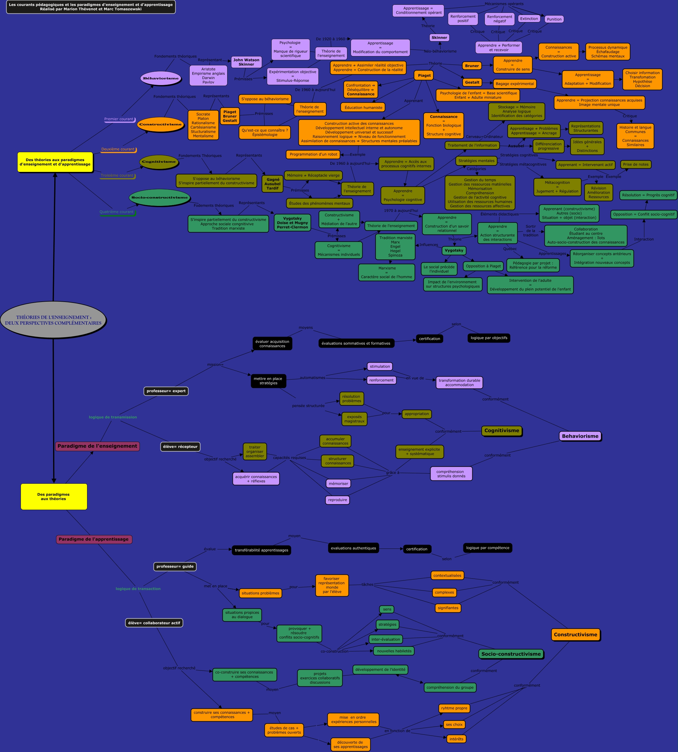 Cette carte de concepts créée avec IHMC CmapTools traite de: Schéma, Skinner Théorie Apprentissage = Conditionnement opérant, Vygotsky Opposition à Piaget, élève= collaborateur actif objectif recherché construire ses connaissances + compétences, intérêts conformément Constructivisme, Théorie de l'enseignement 1970 à aujourd'hui Apprendre = Construction d'un savoir relationnel, transférabilité apprentissages moyen evaluations authentiques, professeur= guide met en place situations problèmes, Piaget Apprenant Construction active des connaissances Développement intellectuel interne et autonome Développement universel et successif Raisonnement logique ⇒ Niveau de fonctionnement Assimilation de connaissances ⇒ Structures mentales préalables, Apprentissage = Adaptation + Modification Choisir information Transfomation Hypothèse Décision, sens conformément Socio-constructivisme, Paradigme de l'apprentissage logique de transaction élève= collaborateur actif, accumuler connaissances capacités requises mémoriser, Punition Critique Apprendre ≠ Performer et recevoir, Bagage expérimental Apprendre = Projection connaissances acquises Image mentale unique, construire ses connaissances + compétences moyen études de cas + problèmes ouverts, traiter organiser assembler capacités requises acquérir connaissances + réflexes, Piaget Éducation humaniste, compréhension stimulis donnés grâce à reproduire, Apprentissage = Conditionnement opérant Mécanismes opérants Renforcement négatif, Apprendre = Construire de sens Connaissances = Construction active