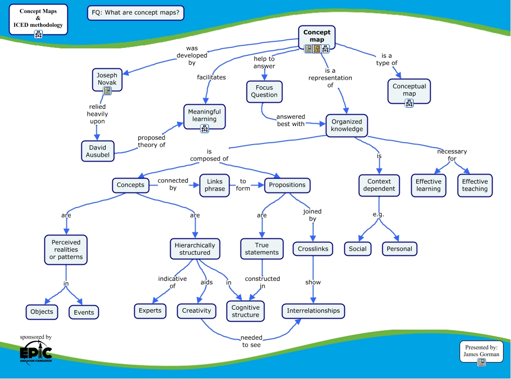 This Concept Map, created with IHMC CmapTools, has information related to: Concept Maps, Propositions joined by Crosslinks, Organized knowledge is composed of Propositions, Concept map facilitates Meaningful learning, Perceived realities or patterns in Objects, Concept map is a type of Conceptual map, Organized knowledge is Context dependent, Organized knowledge necessary for Effective teaching, Organized knowledge is composed of Concepts, Organized knowledge necessary for Effective learning, Concepts are Hierarchically structured, Concept map was developed by Joseph Novak, Hierarchically structured in Cognitive structure, Perceived realities or patterns in Events, Concept map help to answer Focus Question, Joseph Novak relied heavily upon David Ausubel, Propositions are True statements, Focus Question answered best with Organized knowledge, Hierarchically structured indicative of Experts, David Ausubel proposed theory of Meaningful learning, Hierarchically structured aids Creativity