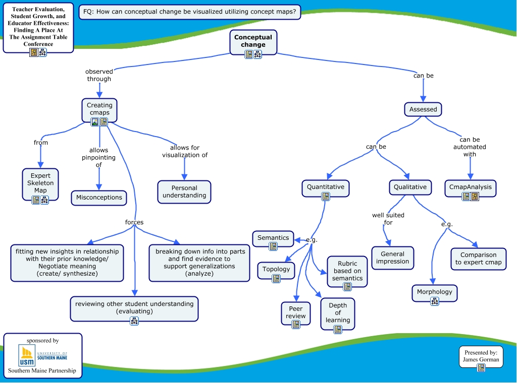 This Concept Map, created with IHMC CmapTools, has information related to: Conceptual Change, Assessed can be automated with CmapAnalysis, Qualitative well suited for General impression, Conceptual change observed through Creating cmaps, Quantitative e.g. Rubric based on semantics, Qualitative e.g. Comparison to expert cmap, Creating cmaps allows for visualization of Personal understanding, Quantitative e.g. Peer review, Assessed can be Quantitative, Quantitative e.g. Topology, Qualitative e.g. Morphology, Quantitative e.g. Depth of learning, Creating cmaps allows pinpointing of Misconceptions, Creating cmaps forces breaking down info into parts and find evidence to support generalizations (analyze), Creating cmaps forces reviewing other student understanding (evaluating), Assessed can be Qualitative, Creating cmaps forces fitting new insights in relationship with their prior knowledge/ Negotiate meaning (create/ synthesize), Quantitative e.g. Semantics, Conceptual change can be Assessed, Creating cmaps from Expert Skeleton Map