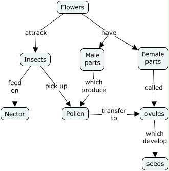 This Concept Map, created with IHMC CmapTools, has information related to: flowers - network, Pollen transfer to ovules, Male parts which produce Pollen, ovules which develop seeds, Flowers have Female parts, Flowers have Male parts, Insects feed on Nector, Flowers attrack Insects, Insects pick up Pollen, Female parts called ovules