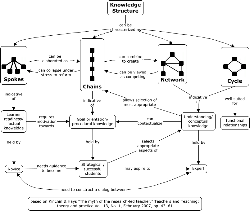 This Concept Map, created with IHMC CmapTools, has information related to: Morphology and Stages of Acedemic Development, Cycle indicative of Understanding/ conceptual knowledge, Chains indicative of Goal orientation/ procedural knowledge, Chains can collapse under stress to reform Spokes, Novice needs guidance to become Strategically successful students, Learner readiness/ factual knoweldge requires motivation towards Goal orientation/ procedural knowledge, Strategically successful students may aspire to Expert, Network can be viewed as competing Chains, Understanding/ conceptual knowledge held by Expert, Understanding/ conceptual knowledge can contextualize Goal orientation/ procedural knowledge, Chains can combine to create Network, Goal orientation/ procedural knowledge held by Strategically successful students, Strategically successful students selects appropriate aspects of Understanding/ conceptual knowledge, Knowledge Structure can be characterized as Network, Knowledge Structure can be characterized as Spokes, Network indicative of Understanding/ conceptual knowledge, Understanding/ conceptual knowledge allows selection of most appropriate Chains, Spokes can be elaborated as Chains, Learner readiness/ factual knoweldge held by Novice, Knowledge Structure can be characterized as Cycle, Cycle well suited for functional relationships