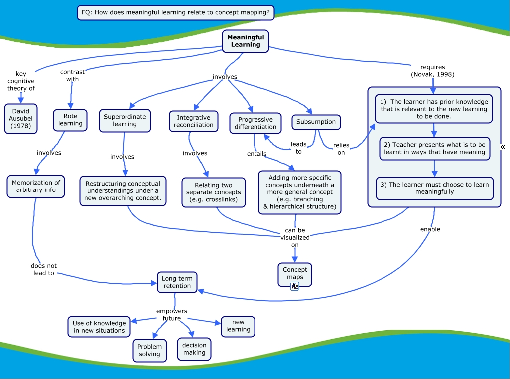 This Concept Map, created with IHMC CmapTools, has information related to: Meaningful Learning, Meaningful Learning key cognitive theory of David Ausubel (1978), Meaningful Learning requires (Novak, 1998) 2) Teacher presents what is to be learnt in ways that have meaning, Integrative reconciliation involves Relating two separate concepts (e.g. crosslinks), Long term retention empowers future decision making, Progressive differentiation entails Adding more specific concepts underneath a more general concept (e.g. branching & hierarchical structure), Memorization of arbitrary info does not lead to Long term retention, Superordinate learning involves Restructuring conceptual understandings under a new overarching concept., Long term retention empowers future Use of knowledge in new situations, Meaningful Learning requires (Novak, 1998) 3) The learner must choose to learn meaningfully, Subsumption relies on 1) The learner has prior knowledge that is relevant to the new learning to be done., Meaningful Learning contrast with Rote learning, Meaningful Learning involves Integrative reconciliation, Long term retention empowers future new learning, Restructuring conceptual understandings under a new overarching concept. can be visualized on Concept maps, Meaningful Learning requires (Novak, 1998) 1) The learner has prior knowledge that is relevant to the new learning to be done., Adding more specific concepts underneath a more general concept (e.g. branching & hierarchical structure) can be visualized on Concept maps, Subsumption leads to Progressive differentiation, Meaningful Learning involves Progressive differentiation, 3 requirement enable Long term retention, Meaningful Learning involves Subsumption