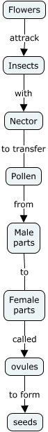 This Concept Map, created with IHMC CmapTools, has information related to: flowers - chain, Female parts called ovules, Flowers attrack Insects, ovules to form seeds, Pollen from Male parts, Insects with Nector, Male parts to Female parts, Nector to transfer Pollen