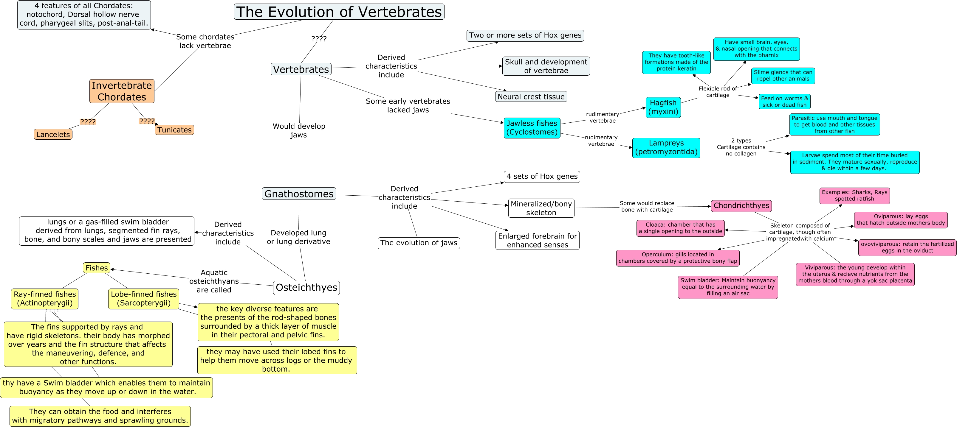 This Concept Map, created with IHMC CmapTools, has information related to: Vertebrates-Group 3, Fishes ???? Ray-finned fishes (Actinopterygii), The Evolution of Vertebrates Some chordates lack vertebrae Invertebrate Chordates, Chondrichthyes Skeleton composed of cartilage, though often impregnatedwith calcium Viviparous: the young develop within the uterus & recieve nutrients from the mothers blood through a yok sac placenta, Chondrichthyes Skeleton composed of cartilage, though often impregnatedwith calcium Oviparous: lay eggs that hatch outside mothers body, Chondrichthyes Skeleton composed of cartilage, though often impregnatedwith calcium Examples: Sharks, Rays spotted ratfish, Hagfish (myxini) Flexible rod of cartilage They have tooth-like formations made of the protein keratin, Gnathostomes Derived characteristics include Mineralized/bony skeleton, Ray-finned fishes (Actinopterygii) ???? The fins supported by rays and have rigid skeletons. their body has morphed over years and the fin structure that affects the maneuvering, defence, and other functions., Chondrichthyes Skeleton composed of cartilage, though often impregnatedwith calcium Operculum: gills located in chambers covered by a protective bony flap, Fishes ???? Lobe-finned fishes (Sarcopterygii), Osteichthyes Aquatic osteichthyans are called Fishes, Jawless fishes (Cyclostomes) rudimentary vertebrae Lampreys (petromyzontida), Ray-finned fishes (Actinopterygii) ???? They can obtain the food and interferes with migratory pathways and sprawling grounds., Hagfish (myxini) Flexible rod of cartilage Slime glands that can repel other animals, Mineralized/bony skeleton Some would replace bone with cartilage Chondrichthyes, Lobe-finned fishes (Sarcopterygii) d the key diverse features are the presents of the rod-shaped bones surrounded by a thick layer of muscle in their pectoral and pelvic fins., Osteichthyes Derived characteristics include lungs or a gas-filled swim bladder derived from lungs, segmented fin rays, bone, and bony scales and jaws are presented, Vertebrates Would develop jaws Gnathostomes, Chondrichthyes Skeleton composed of cartilage, though often impregnatedwith calcium Cloaca: chamber that has a single opening to the outside, Vertebrates Derived characteristics include Skull and development of vertebrae