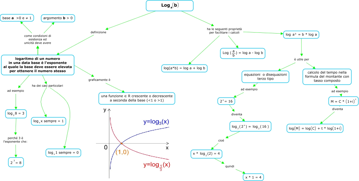 Questa Cmap, creata con IHMC CmapTools, contiene informazioni relative a: Logaritmi, equazioni o disequazioni terzo tipo ad esempio <math xmlns="http://www.w3.org/1998/Math/MathML"> <mrow> <mmultiscripts> <mtext> 2 </mtext> <none/> <mtext> x </mtext> </mmultiscripts> <mtext> = 16 </mtext> </mrow> </math>, logaritmo di un numero in una data base è l'esponente al quale la base deve essere elevata per ottenere il numero stesso ha dei casi particolari <math xmlns="http://www.w3.org/1998/Math/MathML"> <mrow> <mmultiscripts> <mtext> log </mtext> <mtext> x </mtext> <none/> </mmultiscripts> <mtext> 1 sempre = 0 </mtext> </mrow> </math>, <math xmlns="http://www.w3.org/1998/Math/MathML"> <mmultiscripts> <mtext> Log </mtext> <mtext> a </mtext> <none/> </mmultiscripts> <mfenced open="(" close=")"> <mtext> b </mtext> </mfenced> </math> ha le seguenti proprietà per facilitare i calcoli <math xmlns="http://www.w3.org/1998/Math/MathML"> <mrow> <mtext> Log ( </mtext> <mfrac> <mtext> a </mtext> <mtext> b </mtext> </mfrac> <mtext> ) = log a - log b </mtext> </mrow> </math>, calcolo del tempo nella formula del montante con tasso composto ad esempio <math xmlns="http://www.w3.org/1998/Math/MathML"> <mrow> <mtext> M = C * </mtext> <mfenced open="(" close=")"> <mtext> 1+i </mtext> </mfenced> <mmultiscripts> <mtext> </mtext> <none/> <mtext> t </mtext> </mmultiscripts> </mrow> </math>, logaritmo di un numero in una data base è l'esponente al quale la base deve essere elevata per ottenere il numero stesso graficamente è <math xmlns="http://www.w3.org/1998/Math/MathML"> <mrow> <mtext> una funzione ∈ R crescente o decrescente
