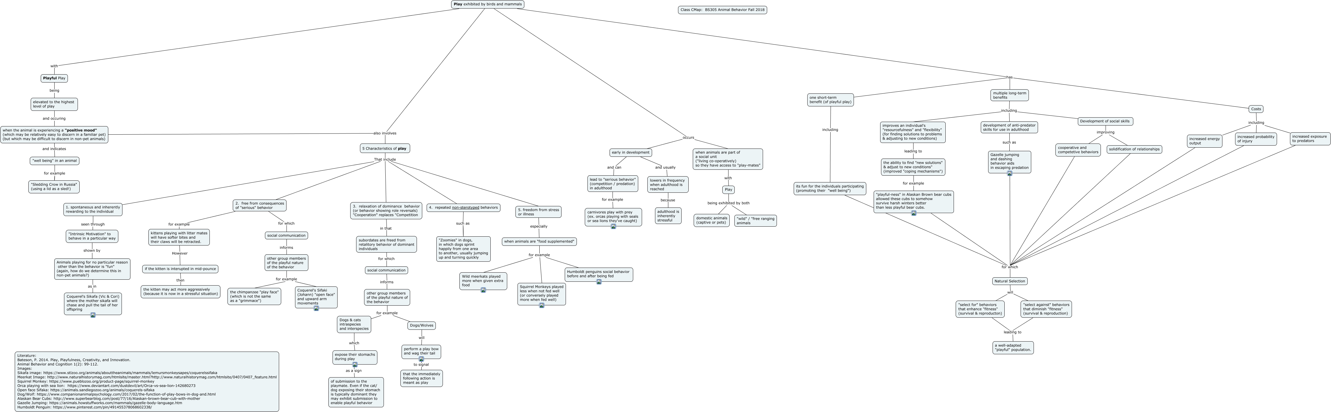 This Concept Map, created with IHMC CmapTools, has information related to: Play in animals 100318 final, 5 Characteristics of play That include 4. repeated non-sterotyped behaviors, Play being exhibited by both "wild" / "free ranging animals, Play exhibited by birds and mammals also involves 5 Characteristics of play, increased probability of injury for which Natural Selection, "well being" in an animal for example "Sledding Crow in Russia" (using a lid as a sled!), perform a play bow and wag their tail to signal that the immediately following action is meant as play, social communication informs other group members of the playful nature of the behavior, lowers in frequency when adulthood is reached because adulthood is inherently stressful, development of anti-predator skills for use in adulthood such as Gazelle jumping and dashing behavior aids in escaping predation, Dogs & cats intraspecies and interspecies which expose their stomachs during play, expose their stomachs during play as a sign of submission to the playmate. Even if the cat/ dog exposing their stomach is typically dominant they may exhibit submission to enable playful behavior, when animals are "food supplemented" for example Squirrel Monkeys played less when not fed well (or conversely played more when fed well), multiple long-term benefits including development of anti-predator skills for use in adulthood, other group members of the playful nature of the behavior for example Dogs & cats intraspecies and interspecies, 1. spontaneous and inherently rewarding to the individual seen through "Intrinsic Motivation" to behave in a particular way, Play exhibited by birds and mammals occurs when animals are part of a social unit ("living co-operatively) so they have access to "play-mates", Development of social skills improving cooperative and competetive behaviors, 5 Characteristics of play That include 5. freedom from stress or illness, "playful-ness" in Alaskan Brown bear cubs allowed these cubs to somehow survive harsh winters better than less playful bear cubs. for which Natural Selection, Play exhibited by birds and mammals has multiple long-term benefits