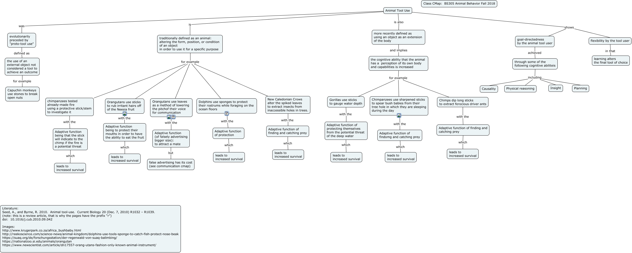 This Concept Map, created with IHMC CmapTools, has information related to: Animal Tool Use 101618, chimpanzees tested already-made fire using a protective stick/stem to investigate it with the Adaptive function being that the stick will indicate to the chimp if the fire is a potential threat, Gorillas use sticks to gauge water depth with the Adaptive function of protecting themselves from the potential threat of the deep water, Chimpanzees use sharpened sticks to spear bush babies from their tree hole in which they are sleeping during the day with the Adaptive function of findomg and catching prey, Animal Tool Use is traditionally defined as an animal: altering the form, position, or condition of an object in order to use it for a specific purpose, Adaptive function of findomg and catching prey which leads to increased survival, Adaptive function of finding and catching prey which leads to increased survival, goal-directedness by the animal tool user achieved through some of the following cognitive abiliteis, through some of the following cognitive abiliteis including Physical reasoning, Adaptive function (of falsely advertising bigger size): to attract a mate but false advertising has its cost (see communication cmap), New Caledonian Crows alter the spiked leaves to extract insects from inaccessible holes in trees. with the Adaptive function of finding and catching prey, through some of the following cognitive abiliteis including Insight, the cognitive ability that the animal has a perception of its own body and capabilities is increased for example Chimps dip long sticks to extract ferocious driver ants, Animal Tool Use was evolutionarily preceded by "proto-tool use", Adaptive function being to protect their mouths in order to have the ability to eat the fruit which leads to increased survival, Animal Tool Use shows goal-directedness by the animal tool user, Chimps dip long sticks to extract ferocious driver ants with the Adaptive function of finding and catching prey, more recently defined as using an object as an extension of the body and implies the cognitive ability that the animal has a perception of its own body and capabilities is increased, traditionally defined as an animal: altering the form, position, or condition of an object in order to use it for a specific purpose for example chimpanzees tested already-made fire using a protective stick/stem to investigate it, traditionally defined as an animal: altering the form, position, or condition of an object in order to use it for a specific purpose for example Orangutans use sticks to rub irritant hairs off of the Neesia fruit, traditionally defined as an animal: altering the form, position, or condition of an object in order to use it for a specific purpose for example New Caledonian Crows alter the spiked leaves to extract insects from inaccessible holes in trees.