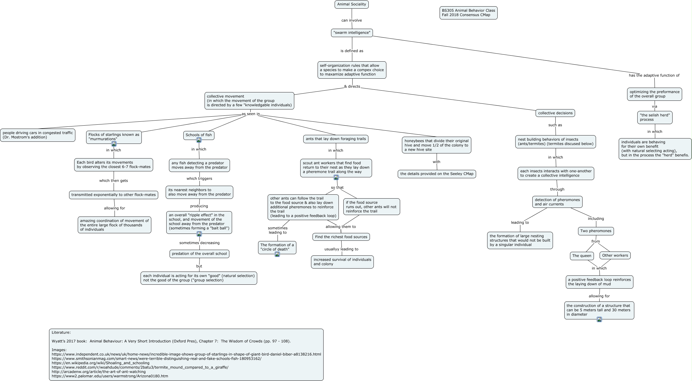 This Concept Map, created with IHMC CmapTools, has information related to: Wyatt Ch 7 Wisdom of Crowds (Sociality) 111618, Other workers in which a positive feedback loop reinforces the laying down of mud, ants that lay down foraging trails in which scout ant workers that find food return to their nest as they lay down a pheremone trail along the way, other ants can follow the trail to the food source & also lay down additional pheremones to reinforce the trail (leading to a positive feedback loop) allowing them to Find the richest food sources, Two pheromones from Other workers, collective movement (in which the movement of the group is directed by a few "knowledgable individuals) as seen in people driving cars in congested traffic (Dr. Mostrom's addition), Each bird alters its movements by observing the closest 6-7 flock-mates which then gets transmitted exponentially to other flock-mates, a positive feedback loop reinforces the laying down of mud allowing for the construction of a structure that can be 5 meters tall and 30 meters in diameter, other ants can follow the trail to the food source & also lay down additional pheremones to reinforce the trail (leading to a positive feedback loop) sometimes leading to The formation of a "circle of death", "swarm intelligence" has the adaptive function of optimizing the preformance of the overall group, Find the richest food sources usuallyy leading to increased survival of individuals and colony, detection of pheromones and air currents leading to the formation of large nesting structures that would not be built by a singular individual, Two pheromones from The queen, optimizing the preformance of the overall group via "the selish herd" process, an overall "ripple effect" in the school, and movement of the school away from the predator (sometimes forming a "bait ball") sometimes decreasing predation of the overall school, "swarm intelligence" is defined as self-organization rules that allow a species to make a compex choice to maxamize adaptive function, any fish detecting a predator moves away from the predator which triggers its nearest neighbors to also move away from the predator, honeybees that divide their original hive and move 1/2 of the colony to a new hive site with the details provided on the Seeley CMap, scout ant workers that find food return to their nest as they lay down a pheremone trail along the way so that if the food source runs out, other ants will not reinforce the trail, scout ant workers that find food return to their nest as they lay down a pheremone trail along the way so that other ants can follow the trail to the food source & also lay down additional pheremones to reinforce the trail (leading to a positive feedback loop), detection of pheromones and air currents including Two pheromones