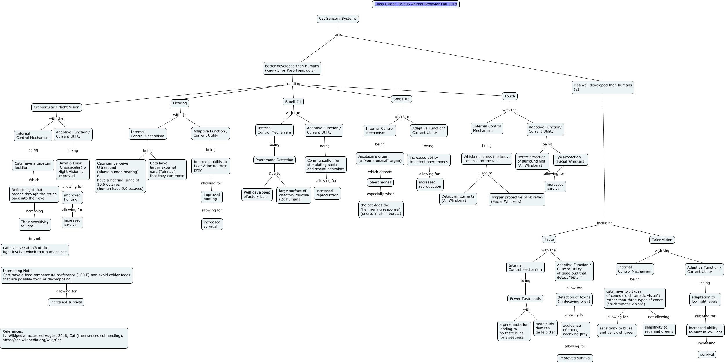 This Concept Map, created with IHMC CmapTools, has information related to: Cat Sensory Systems Final, increased ability to hunt in low light increasing survival, Adaptive Function/ Current Utility being increased ability to detect pheromones, better developed than humans (know 3 for Post-Topic quiz) including Crepuscular / Night Vision, better developed than humans (know 3 for Post-Topic quiz) including Touch, Interesting Note: Cats have a food temperature preference (100 F) and avoid colder foods that are possibly toxic or decomposing allowing for increased survival, Smell #2 with the Internal Control Mechanism, Color Vision with the Adaptive Function / Current Utility, better developed than humans (know 3 for Post-Topic quiz) including Smell #1, Smell #1 with the Adaptive Function / Current Utility, Smell #2 with the Adaptive Function/ Current Utility, Crepuscular / Night Vision with the Internal Control Mechanism, Touch with the Internal Control Mechanism, improved ability to hear & locate their prey allowing for improved hunting, Adaptive Function / Current Utility being Communcation for stimulating social and sexual behvaiors, Reflects light that passes through the retina back into their eye increasing Their sensitivity to light, Communcation for stimulating social and sexual behvaiors allowing for increased reproduction, Pheromone Detection Due to Well developed olfactory bulb, Cats have a tapetum lucidium Which Reflects light that passes through the retina back into their eye, avoidance of eating decaying prey allowing for improved survival, Fewer Taste buds with a gene mutation leading to no taste buds for sweetness