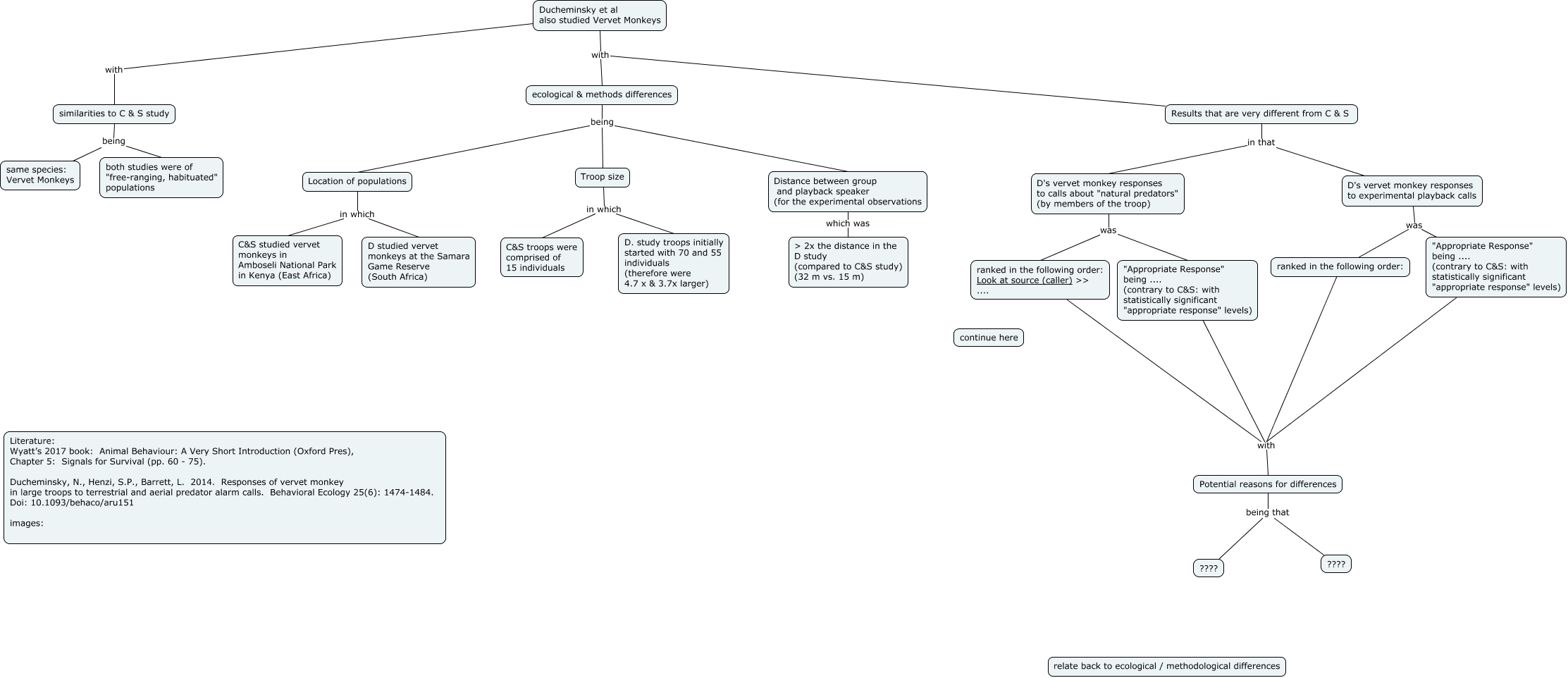 This Concept Map, created with IHMC CmapTools, has information related to: Ducheminsky et al 2014 correct cmap, D's vervet monkey responses to experimental playback calls was ranked in the following order:, Troop size in which D. study troops initially started with 70 and 55 individuals (therefore were 4.7 x & 3.7x larger), D's vervet monkey responses to calls about "natural predators" (by members of the troop) was ranked in the following order: Look at source (caller) >> ...., ecological & methods differences being Location of populations, "Appropriate Response" being .... (contrary to C&S: with statistically significant "appropriate response" levels) with Potential reasons for differences, "Appropriate Response" being .... (contrary to C&S: with statistically significant "appropriate response" levels) with Potential reasons for differences, ranked in the following order: with Potential reasons for differences, ecological & methods differences being Distance between group and playback speaker (for the experimental observations, similarities to C & S study being same species: Vervet Monkeys, Ducheminsky et al also studied Vervet Monkeys with Results that are very different from C & S, D's vervet monkey responses to experimental playback calls was "Appropriate Response" being .... (contrary to C&S: with statistically significant "appropriate response" levels), similarities to C & S study being both studies were of "free-ranging, habituated" populations, Ducheminsky et al also studied Vervet Monkeys with similarities to C & S study, Location of populations in which D studied vervet monkeys at the Samara Game Reserve (South Africa), Results that are very different from C & S in that D's vervet monkey responses to calls about "natural predators" (by members of the troop), Troop size in which C&S troops were comprised of 15 individuals, Results that are very different from C & S in that D's vervet monkey responses to experimental playback calls, Potential reasons for differences being that ????, D's vervet monkey responses to calls about "natural predators" (by members of the troop) was "Appropriate Response" being .... (contrary to C&S: with statistically significant "appropriate response" levels), ecological & methods differences being Troop size